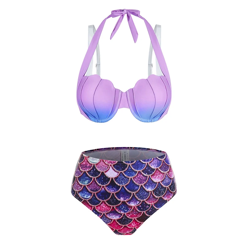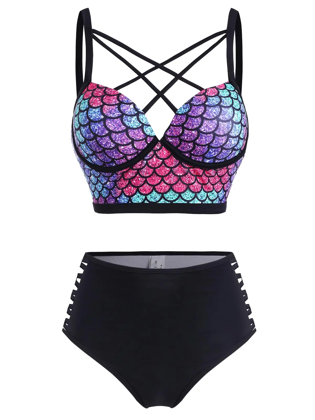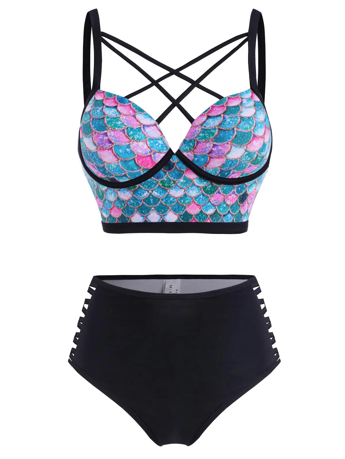 Женское бикини, комплекты с принтом «русалочка» с бретелями крест-накрест и формованные раздельный купальник, сексуальный, с подкладкой, пуш-ап, комплект из двух предметов купальные костюмы пляжный костюм для плавания