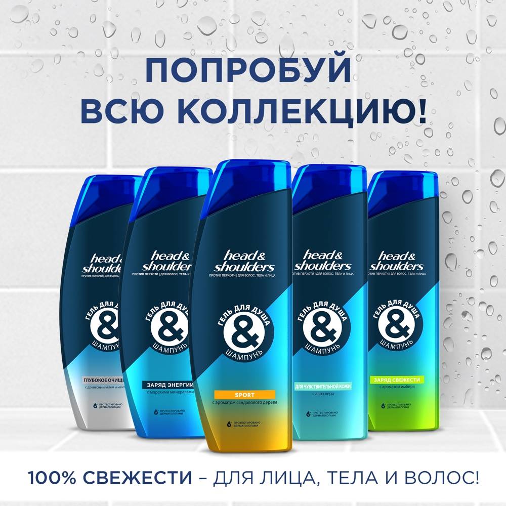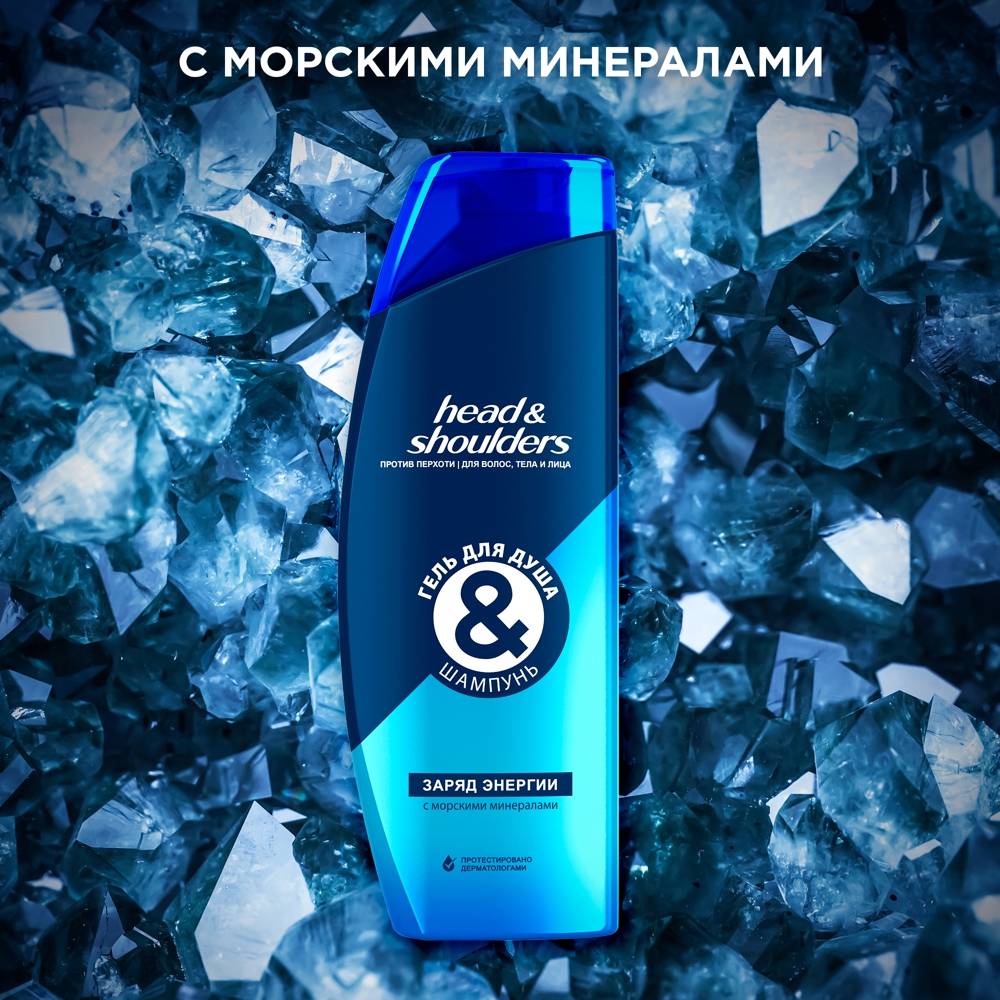 Гель для душа и шампунь против перхоти для волос, лица и тела Head & Shoulders (Хед энд Шолдерс) Заряд Энергии с морскими минералами устраняет загрязнения и восстанавливает кожу головы и тела даже после самых интенсивных тренировок. Один флакон — чистота, свежесть и свобода от перхоти до 100%*. Ухаживающая формула протестирована дерматологами, она мягко очищает все тело, не раздражая кожу, а также эффективно защищает кожу головы от перхоти, жирности и зуда кожи головы. Гель для душа и шампунь против перхоти Head&Shoulders Заряд Энергии прекрасно ухаживает за телом, волосами и кожей головы, полностью оправдывая ожидания самых требовательных мужчин. Head & Shoulders — бренд шампуней № 1 в России**. *Видимой перхоти при регулярном применении. **По продажам. На основании данных NielsenIQ RMS для категории шампуней за 12 мес., завершившихся 30.04.2021, для общего рынка розничной торговли.