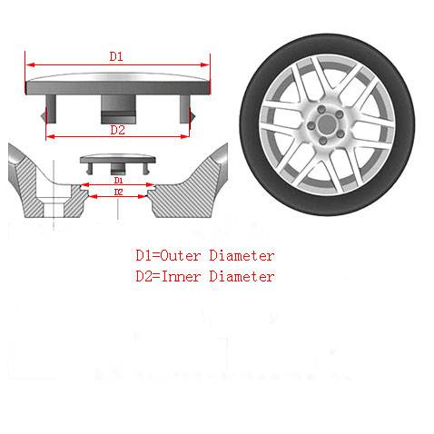 Пожалуйста, измерьте размер (D1 и D2) вашей оригинальной центральной крышки или центрального отверстия колеса, прежде чем сделать заказ.