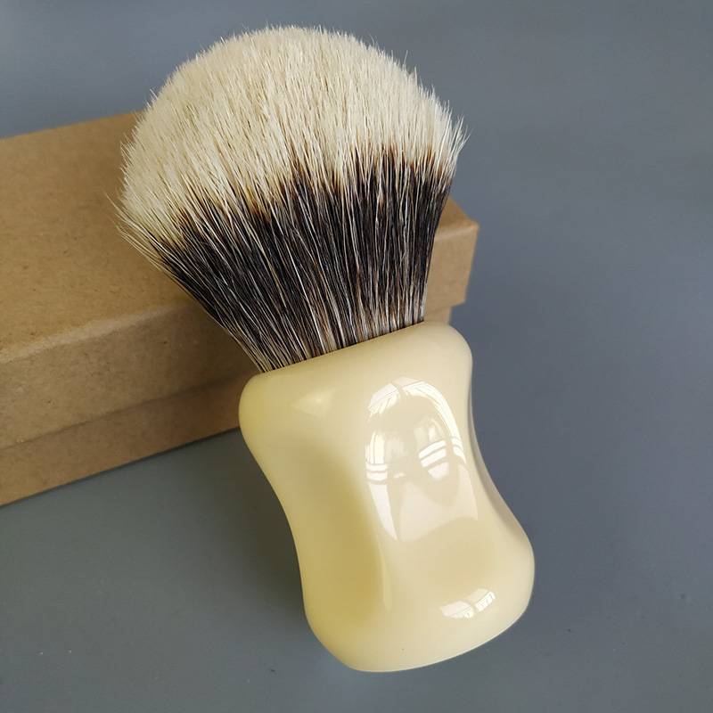 Помазок для бритья Dscosmetic Волосы: маньчжурские двухполосные барсучьи волосы Размер узла: 26 мм Лофт для волос: 48-50 мм Рукоятка: рукоятка слоновая кость, резина Высота ручки: 46 мм Диаметр ручки: 38 мм Общая длина: 98 мм