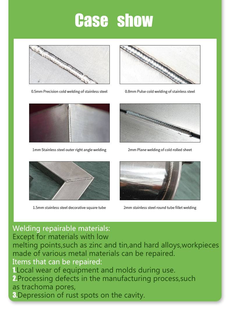 1. Сравнение с обычным аргоновым сварочным аппаратом: Из-за большого воздействия на ремонт обычного аргонно-дугового сварочного аппарата Входная энергия большая, поэтому заготовка легко деформируется и подрезается после сварки. Этот сварочный аппарат успешно преодолевает эту сложность и делает точный сварочный ремонт реальностью. 2. Сравнение с холодными сварочными машинами: Холодные сварочные аппараты (такие как сварочные машины сопротивления, машины размещения и т. д.) на современном рынке, как правило, имеют недостатки, такие как медленная скорость ремонта, низкая склеивание после сварки и меньше сварочных материалов, которые не могут удовлетворить потребности производителей. Тем не менее, этот сварочный аппарат имеет скорость быстрого ремонта, высокую степень склеивания после сварки и полные сварочные материалы. Различные материалы выбираются для различных сварочных материалов. 3. Сравнение с лазерным сварочным аппаратом: точность сварки этого сварочного аппарата близка к точности лазерного сварочного аппарата, но гибкость сварочного ремонта намного больше, чем у лазерного сварочного аппарата, И поскольку различная толщина сварочной проволоки может быть выбрана в зависимости от количества ремонта, Скорость ремонта сварки значительно улучшается, имеет большее преимущество в цене, имеет очень высокую стоимость.