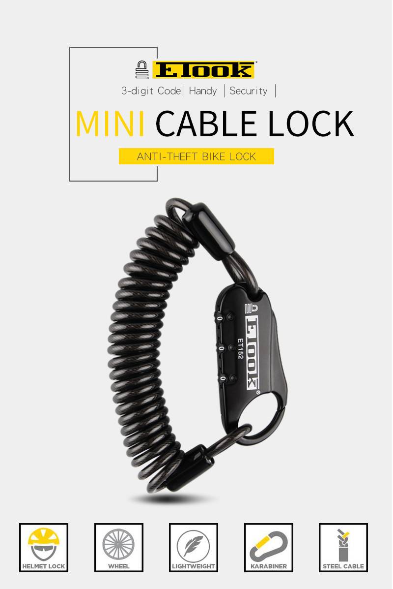 * Удобный размер, легко хранить и переносить; * 3 х значный кодовый, безопасность и простота в эксплуатации; * Многофункциональный, не только для велосипедов, шлемов, багажных замков, замок рюкзака... * ETOOK, Лидирующий бренд на замке.