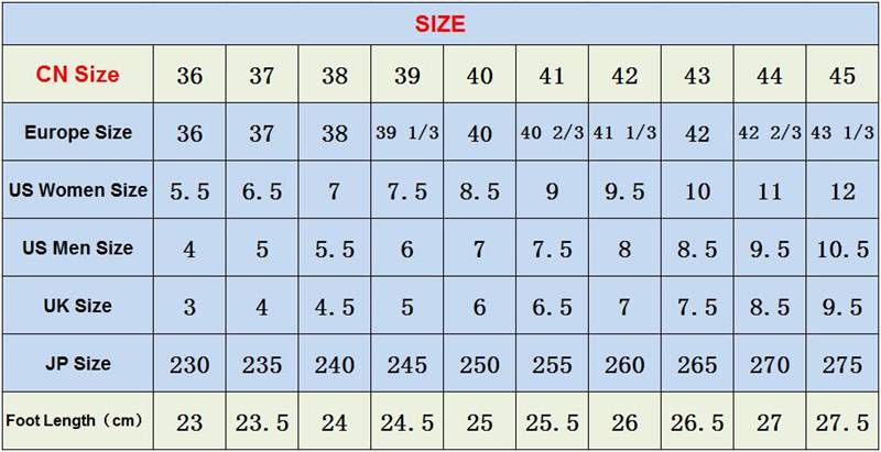 Это не европейский размер.Пожалуйста, выберите размер в соответствии с длиной Вашей стопы, как показано в таблице размеров ниже. Если ваша стопа широкая или толстая, пожалуйста, выберите больший размер обуви.