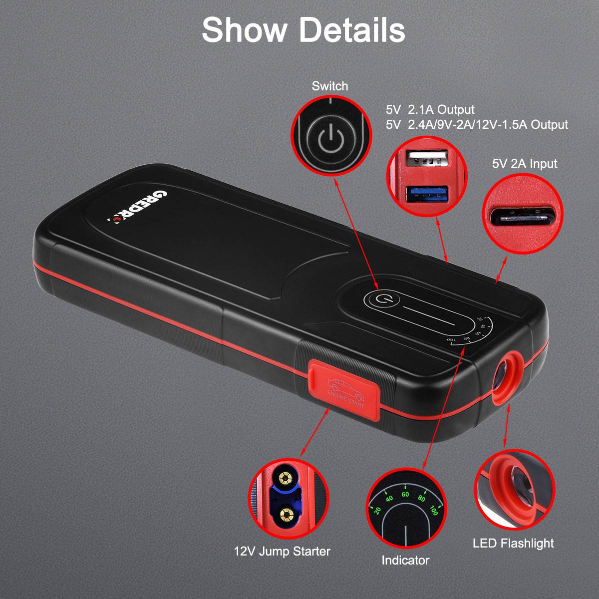 Автомобильный Аккумуляторный стартер Grepro способен запускать все виды транспортных средств 12 В (для газовых двигателей до 7,5л или дизельных двигателей до 6,5л) до 20 раз без необходимости перезарядки, работ, для мотоцикла, RV, трактора, светильник грузовых автомобилей малой грузоподъемности, газонокосилка, cargo, квадроциклов, снегоходов, лодка и т. д.