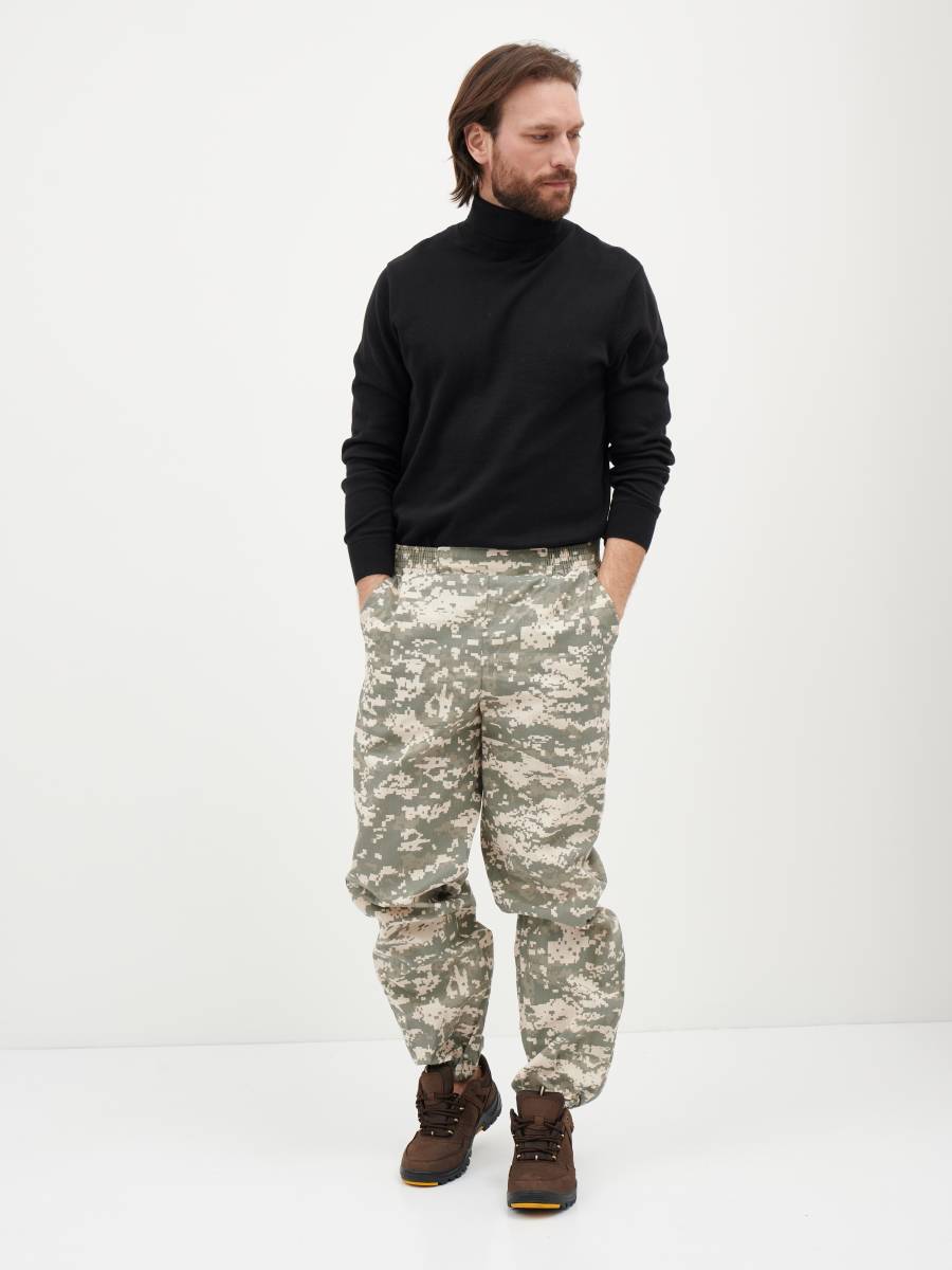 Брюки свободного кроя. По бокам расположены 2 прорезных объёмных кармана. По низу брюк предусмотрены манжеты с широкой резинкой. Пояс так же выполнен из широкой резинки, которая прекрасно прилегает к телу и не давит.