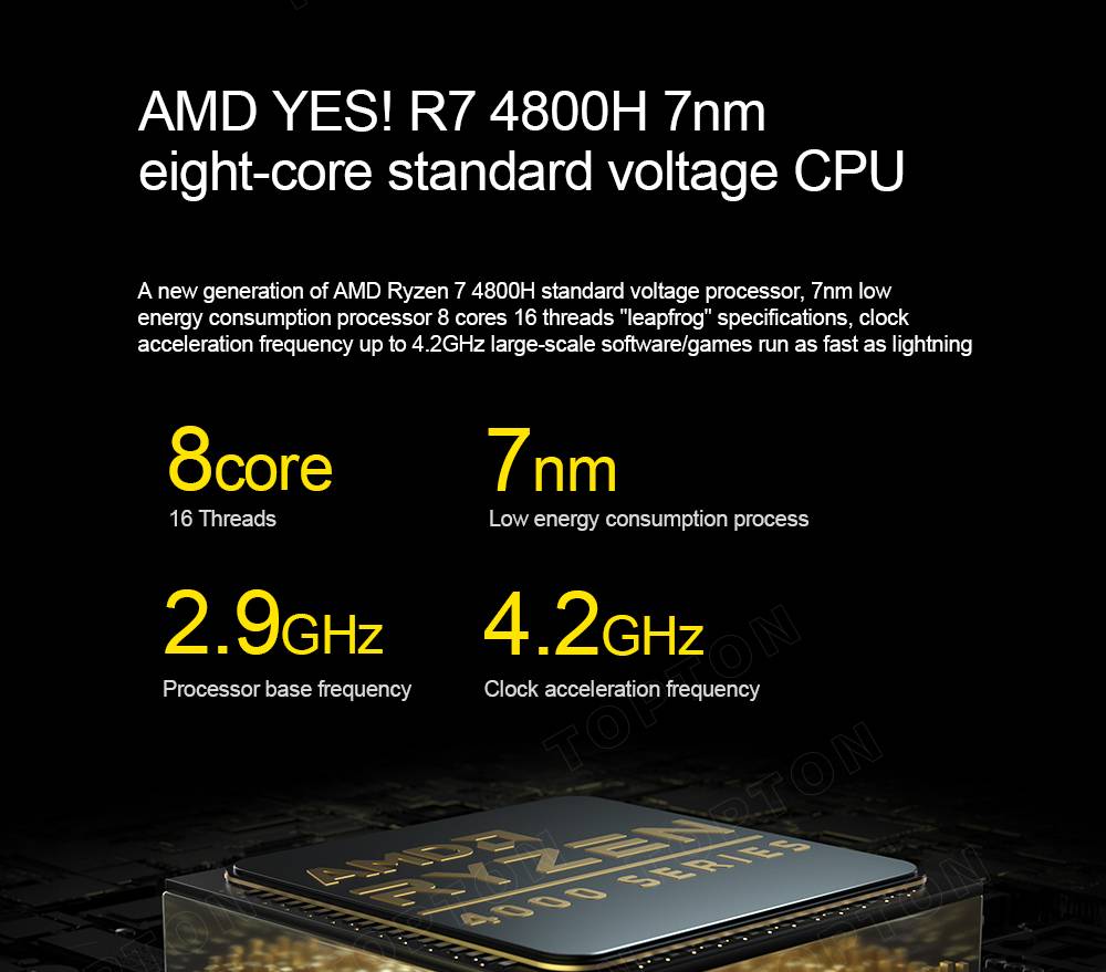2.7 нмAMD Ryzen 7 4800H 8 ядер 16 потоков 2,9 ГГц до 4,2 ГГц 8 Мб кэш TDP 45 Вт Radeon™Графика 7 ядер 1600 МГц.