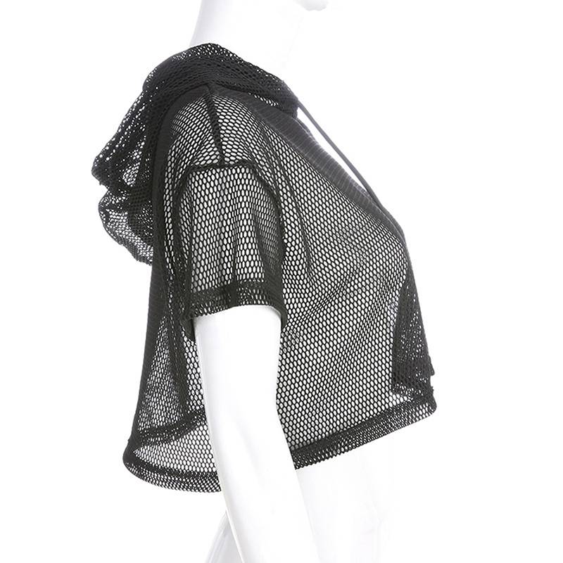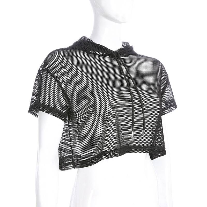 Женская футболка с коротким рукавом, сетчатый топ с капюшоном, открытые сексуальные шорты в стиле панк-рок, укороченный топ, белая футболка, ажурная черная