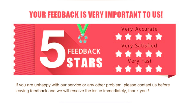 Отзывы: Мы поддерживаем высокие стандарты качества и стремимся к 100% удовлетворенности клиентов! Отзывы очень важны! Мы просим Вас связаться с нами немедленно, прежде чем дать нам нейтральные или отрицательные отзывы, чтобы мы могли удовлетворительно решить ваши проблемы. Мы ценим 5-звездочный положительный отзывы, это хорошо для нашего долгосрочного бизнеса. Мы также отправим вам такие же отзывы.