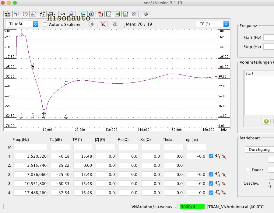 На следующих схемах показана потеря передачи 4 фильтров с низким проходом. Он был измерен с помощью YanaVNA-BT и визуализирован с помощью программы VNAJ. Маркеры на диаграмме настроены на следующие частоты: Маркер 1: старт SW band Маркер 2: старт SW band * 2 Маркер 3: старт SW band * 3 Маркер 4: старт SW band * 5 Если иное не установлено в более высоком частотном диапазоне, потому что используемое измерительное устройство YanaVNA-BT работает только до 65 МГц.