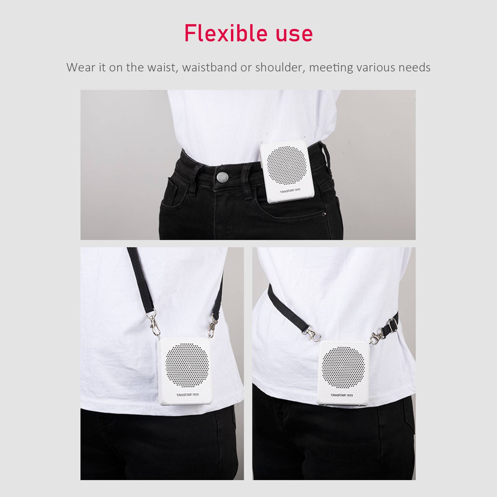 Этот высокомощный беспроводной голосовой усилитель способен передавать громкий и чистый звук и предоставляет такие функции, как аудио и музыкальный плеер и fm-радио, многофункциональные и практичные, широко используются в обучении, Гиде тура, презентация, продвижение и мероприятия на свежем воздухе. Он доступен в двух вариантах-голосовой усилитель с ручным микрофоном и голосовым усилителем с головным микрофоном-для людей с различными потребностями.