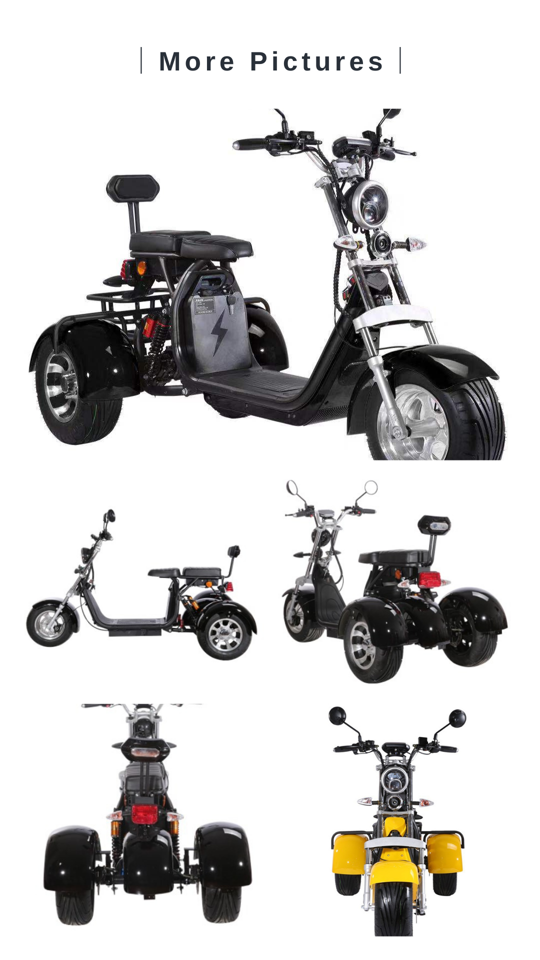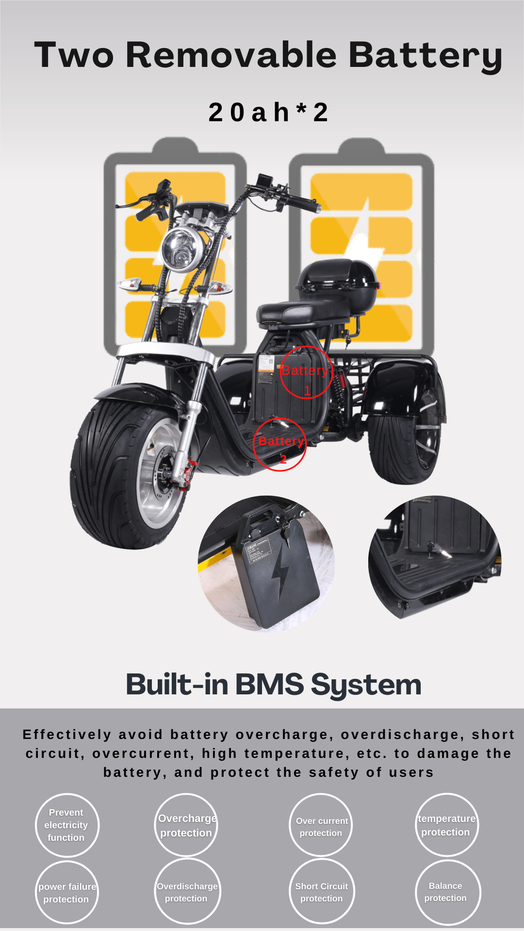 В Citycoco trike 3-Х Колесный Самокат приведенный в действие 2000 Вт мотор шпинделя, 60V 40Ah батареи. Он оснащен передней и задней подвеской, механическими тормозными дисками и съемной батареей и более удобен, эргономичен и привлекателен благодаря своей конструкции, которая эмульгирует мотоцикл.