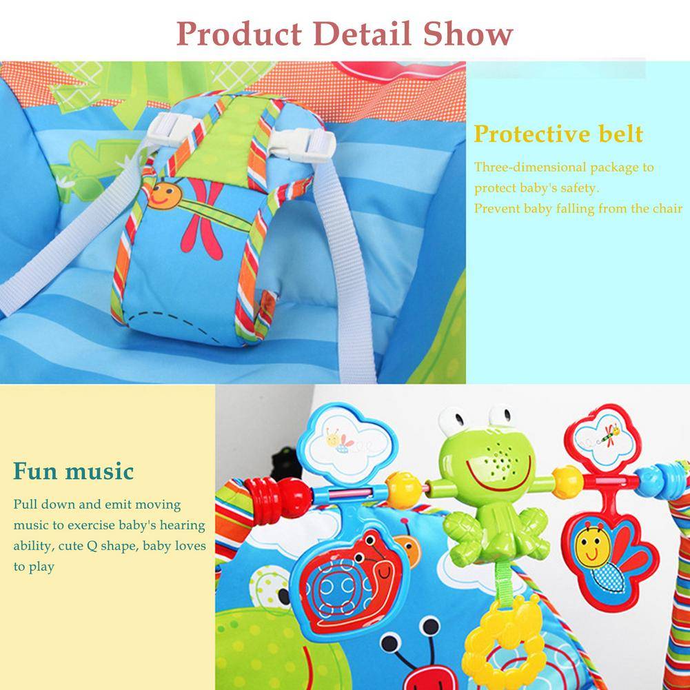 1. Регулируемый кронштейн: это кресло-качалка имеет Подвижный кронштейн с 3 висящими милыми игрушками в форме животных. Вытягивание может излучать подвижную музыку и тренировать слуховые способности ребенка. Игрушка привлекательная и забавная для ребенка. Это помогает матерям освободить руки.