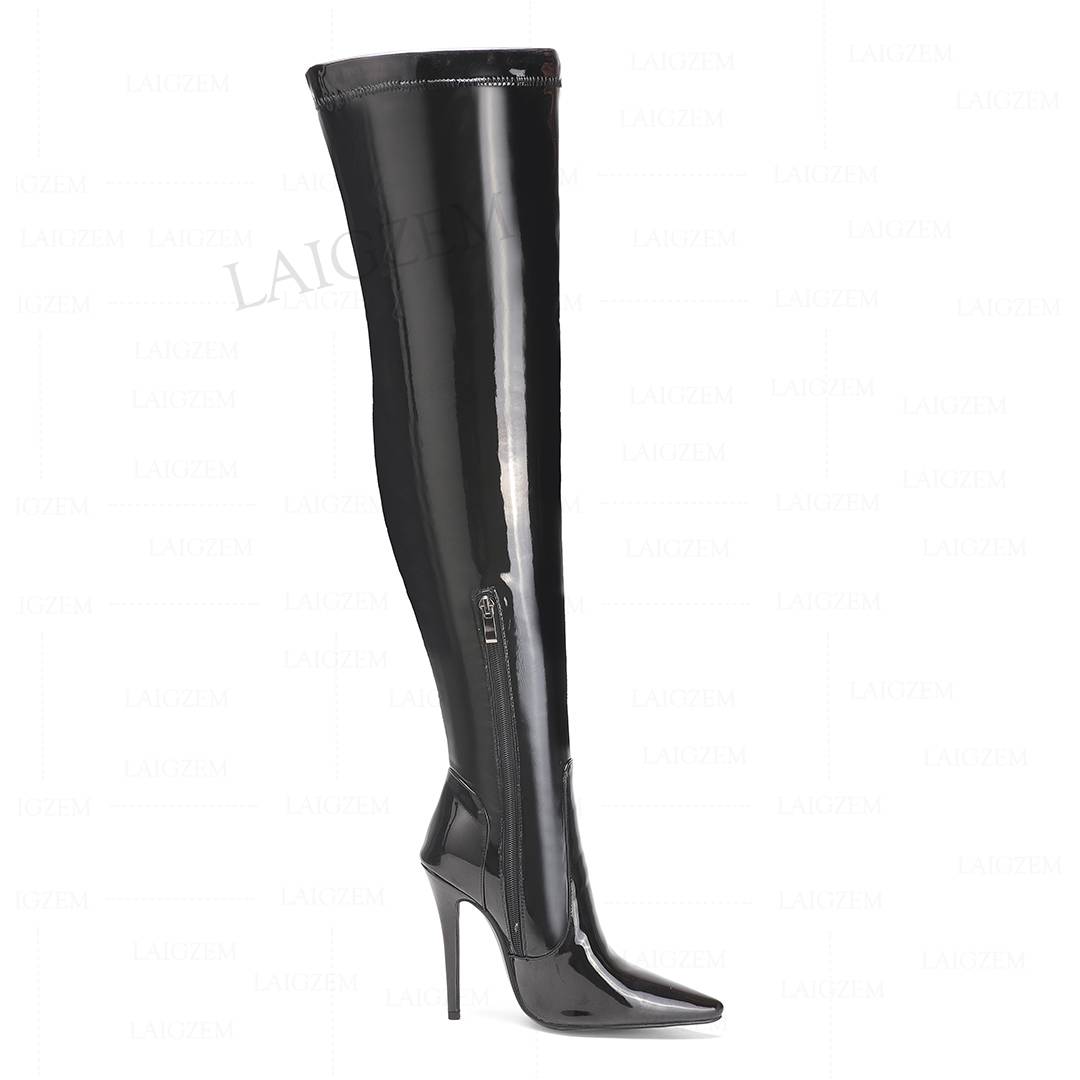 LAIGZEM/женские ботфорты выше колена; Блестящие женские сапоги на высоком каблуке 12 см на молнии сбоку; Женская обувь; Большие размеры 40, 42, 46