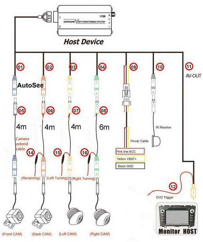 1. Главный хост 2. Основной кабель 3. Удлинительные кабели камеры 4, 4, 4, 6 метров