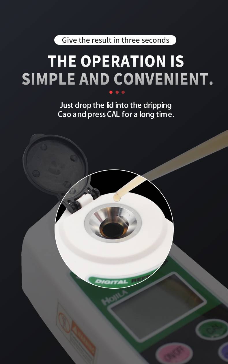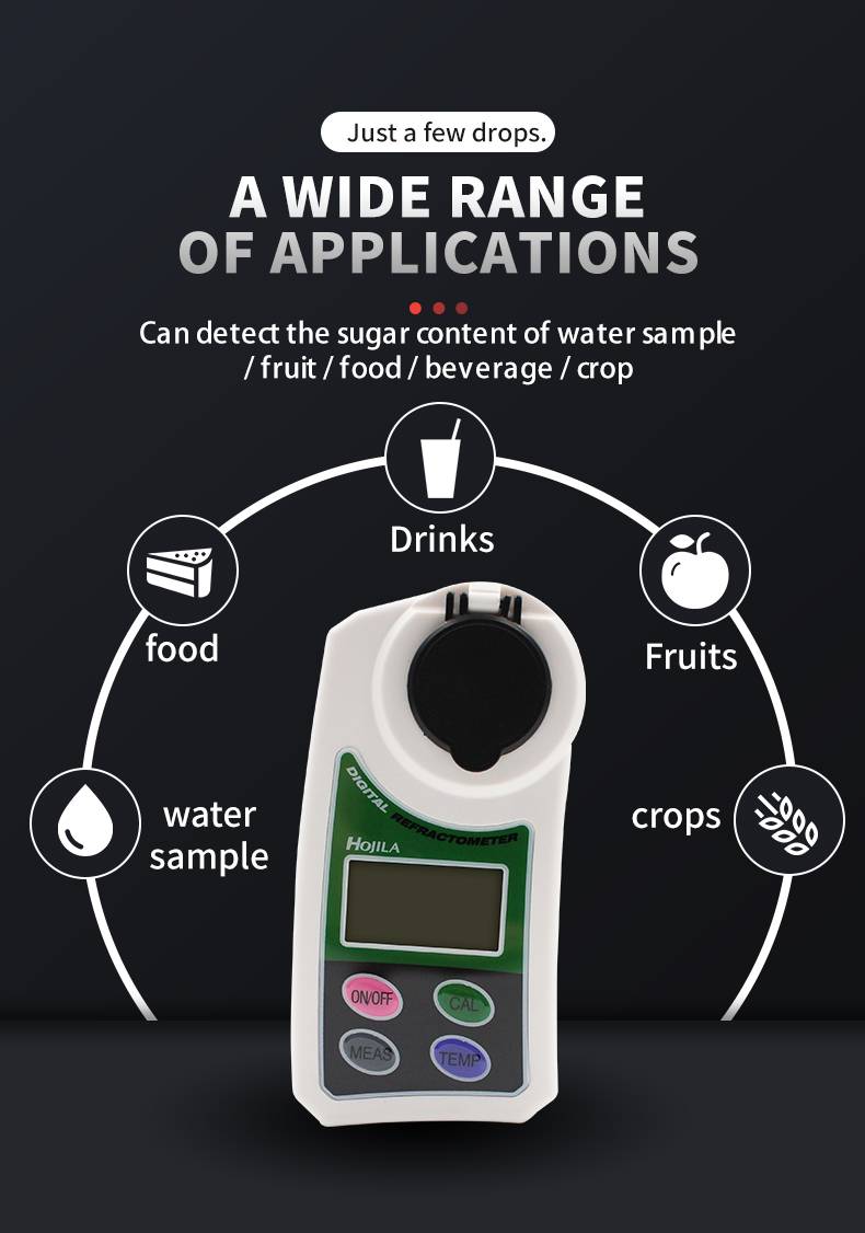 Цифровой рефрактометр-это Цифровой Высокоточный оптический инструмент, разработанный по принципу преломления. Он маленький и красивый, простой в использовании и ЖК-дисплей с большим экраном. До тех пор, пока капля раствора образца помещается на призму, измеренное значение будет отображаться в течение 3 секунд, что позволяет избежать субъективной интерпретации ошибок. Профессионально измеряет содержание сахара в образцах воды, пищевых продуктах, фруктах и сельскохозяйственных культур, широко используется в пищевой промышленности, производстве напитков, сельском хозяйстве, сельскохозяйственной пищевой промышленности и т. Д.