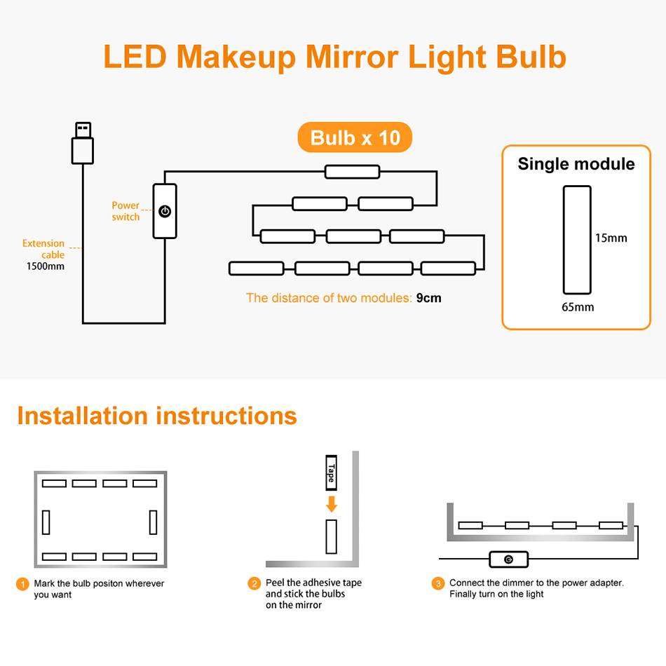 Затемняемые зеркальные лампы: Выберите желаемое освещение при использовании зеркала для макияжа, либо используйте фон для фотосессии, учебники по макияжу или декор для вашей рамки. Наш белый светодиодный свет может быть ярче (1200lm) и теплее для мягких огней одним касанием. Таким образом, нет более неровного макияжа или опоздания на работе или вечеринках.