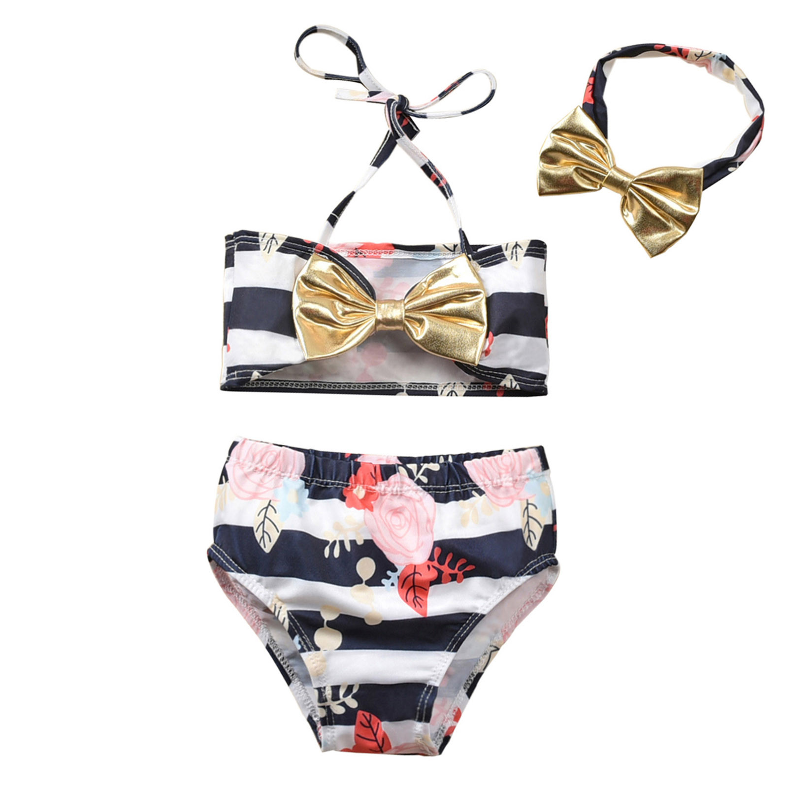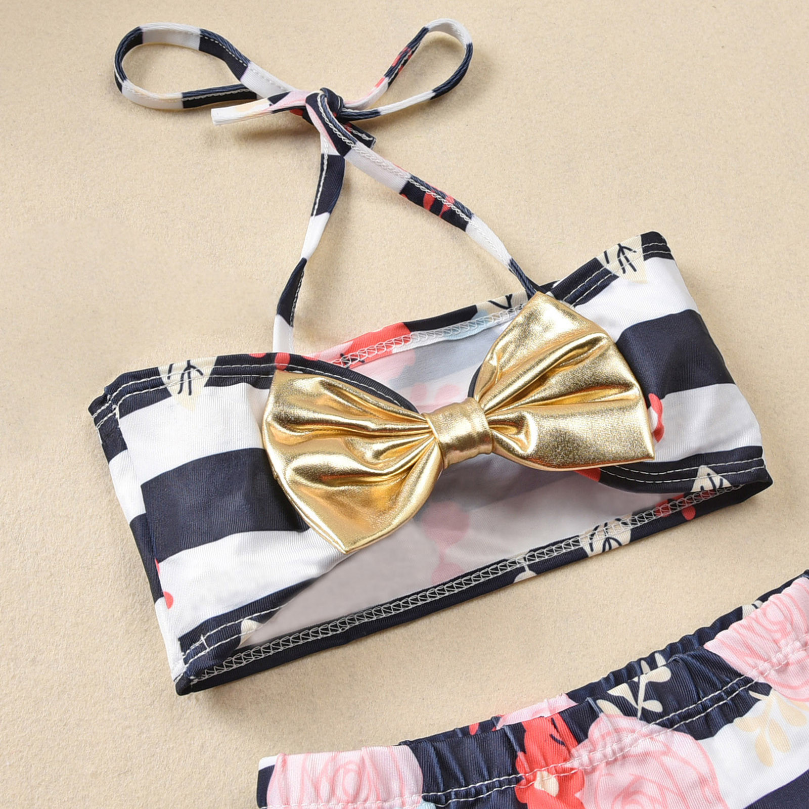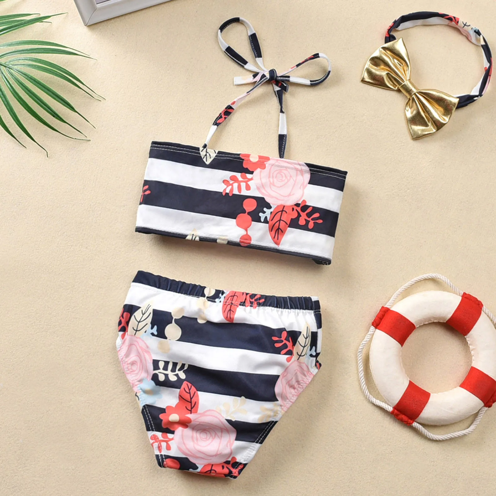 Купальный костюм из трех предметов для маленьких девочек; Пляжный купальный костюм в полоску с бантом и цветочным принтом