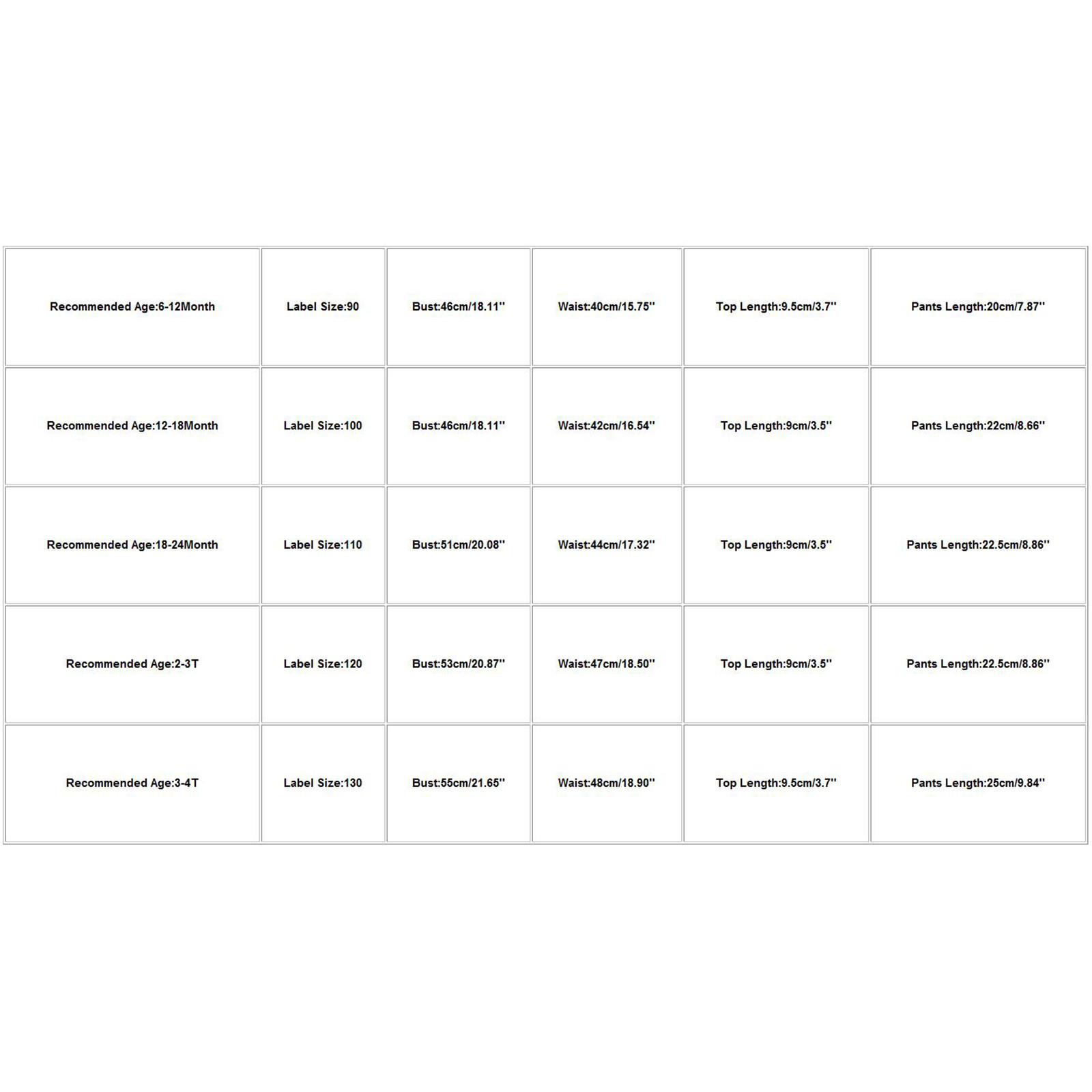| Рекомендуемый возраст | Размер этикетки | Бюст | Талия | Длина верха | Длина брюк |