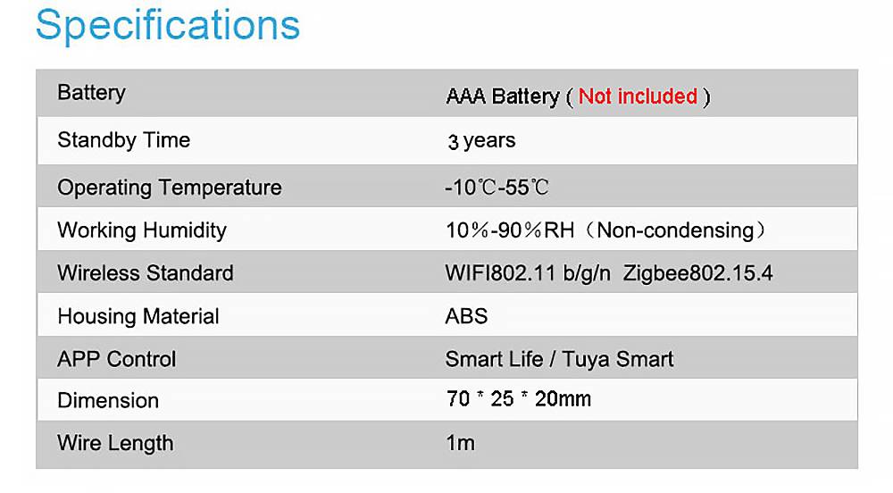 Батарея: LR03-1.5V/AAA * 2 (батарейки не входят в комплект) Беспроводной Тип: 2,4 ГГц IEEE 802.11b/g/n Рабочая температура: 0 ℃ ~ 40 ℃ (32 ℉ ~ 104 ℉) Рабочая влажность: 20% ~ 85% относительной влажности Влажность хранения: 0% ~ 90% относительной влажности Приложение: Tuya smart (поддерживает Android 4,4 и iOS 8,0 или более новый) Материал: АБС-пластик