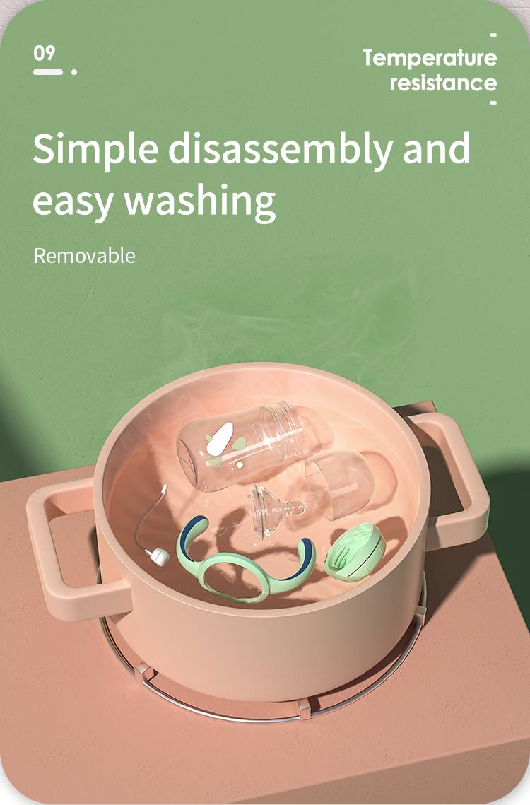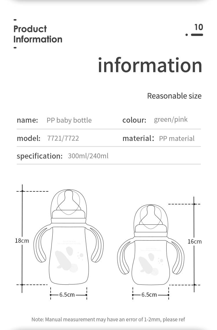 Особенности 1. Циркуляция воздуха с отверстием для сосков, уменьшает пузыри в майке. Ребенок может сосать легче.2. Компактный размер прост в переноске и использовании.3. Корпус бутылки изготовлен из высококачественного материала pp, стойкого и прочного.4. Соска изготовлена из пищевого силикона, безопасность и комфорт.