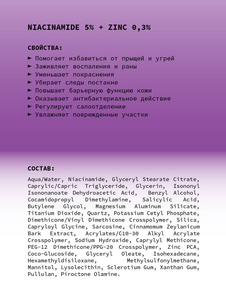 Ниацинамид сужает поры, улучшает защитные функции кожи. Цинк регулирует работу сальных желез, оказывает обеззараживающее и вяжущее действие. Противовоспалительные компоненты обеспечивают сокращение воспалительных элементов. Крем-гель сужает поры и снижает активность сальных желез.