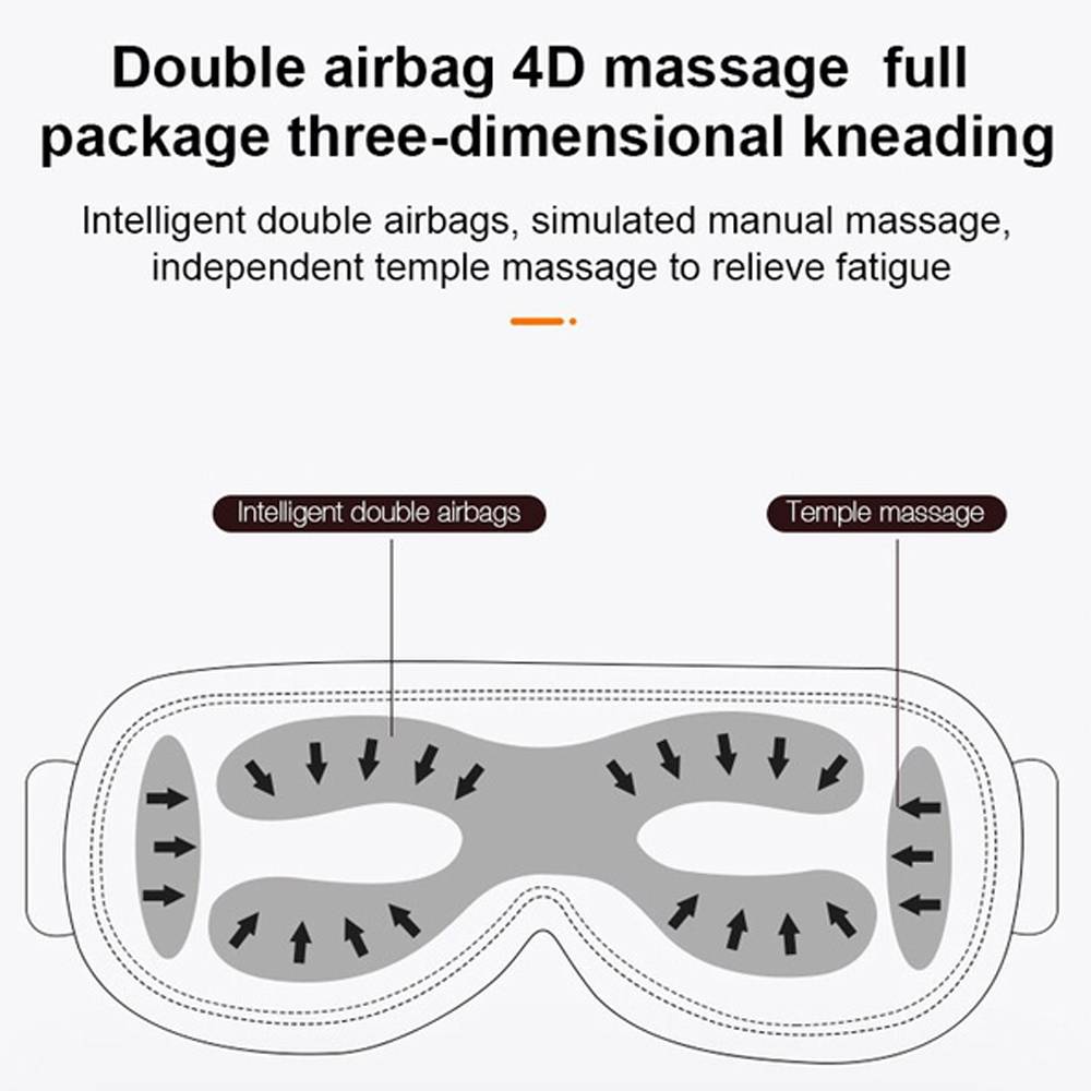 Функция: Вибрационный массаж глаз, нагревательный массаж, музыка по Bluetooth, портативный, складывание на 180 градусов, голосовое напоминание, настройка времени
