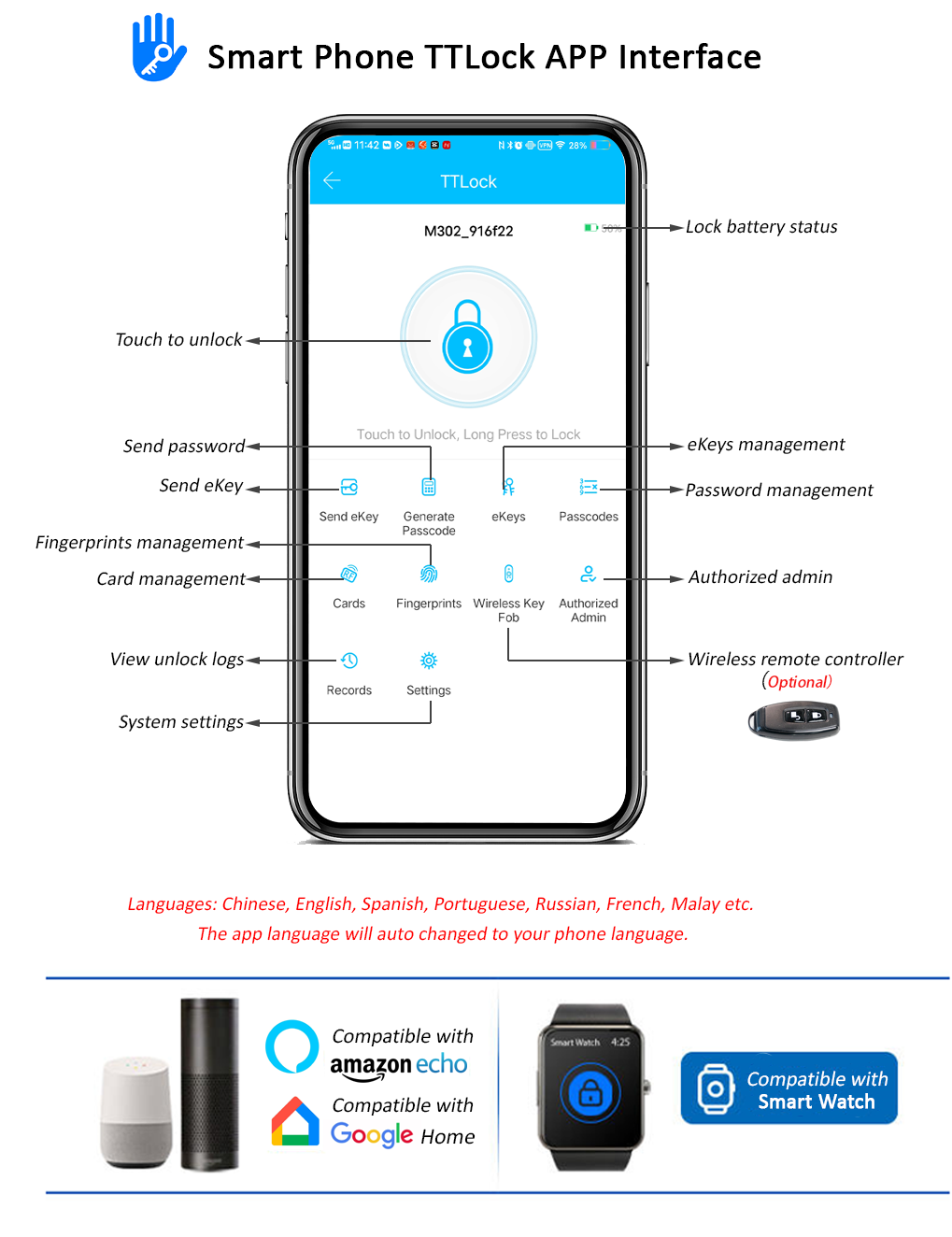 Приложение TTlock удаленно разблокирует дверь через bluetooth, ограниченное расстояние составляет 10 м. Если необходимо разблокировать через wifi, то Блокировка должна подключаться к шлюзу wifi