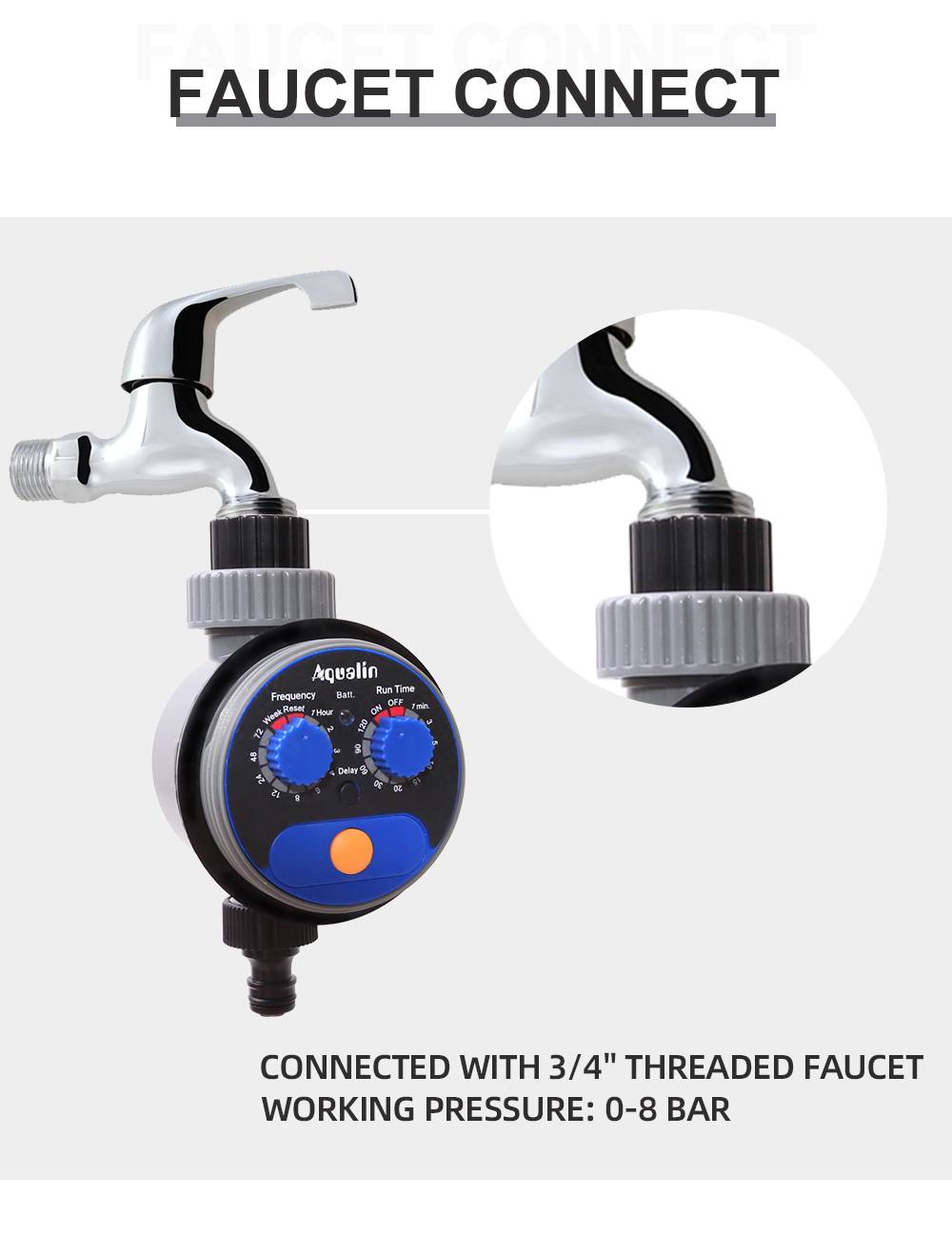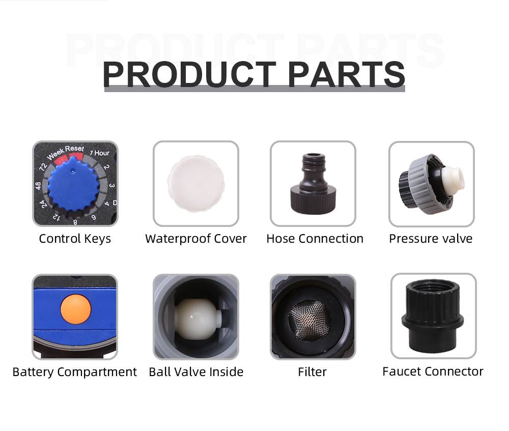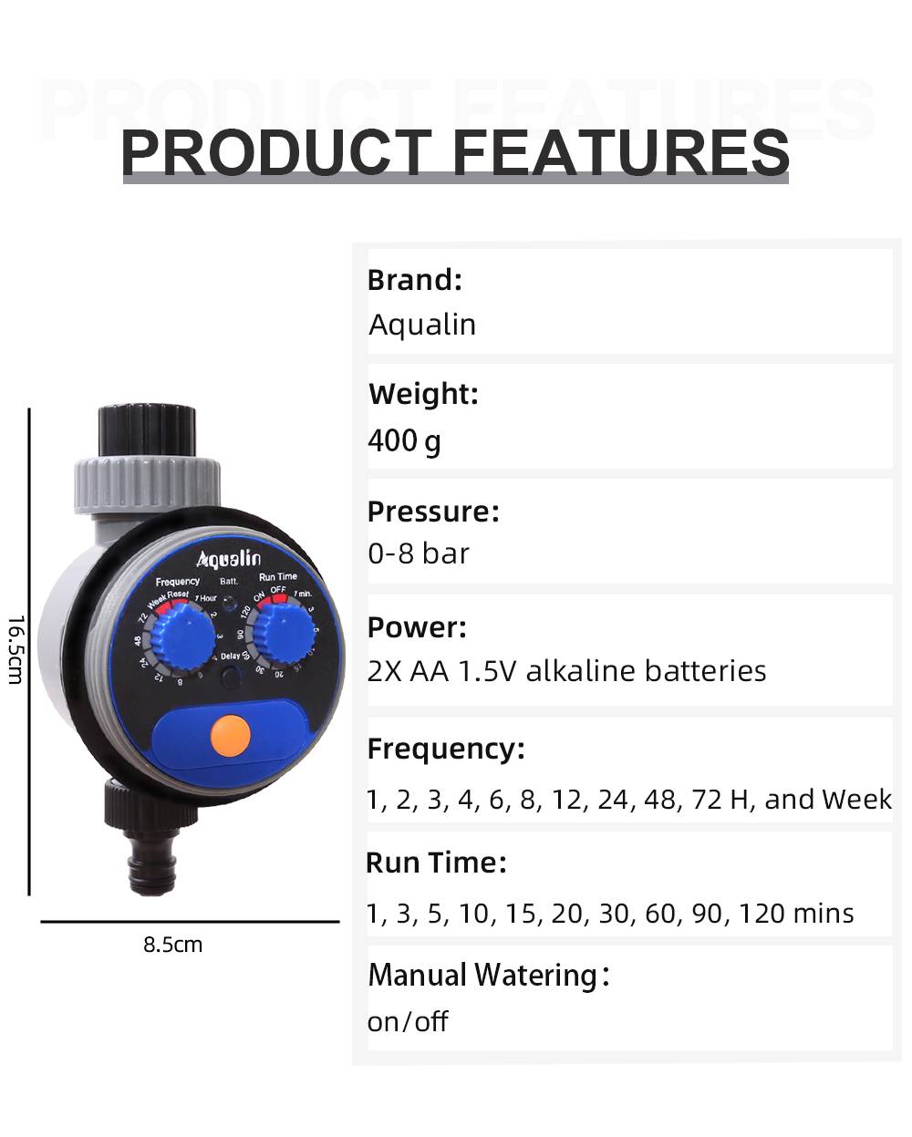 > Питание от аккумулятора (2XAA 1,5 V Щелочная батарея) (Не прилагаются)> СильныйВнутренний шаровой клапан> Woring давление: от 0 до 8 бар (0-116 PSI)> Рабочая температура: 5-60C(40-140F)> Доступны ручные поливы (вкл/выкл)> Может быть прикреплен к3/4 ''(19 мм)Кран или кран> После установки программы, он будет повторять циклы до новых настроек> Частота: (может быть установлен на 1, 2, 3, 4, 6, 8, 12, 24, 48, 72 H и неделю)> Время работы: (может быть установлен на 1, 3, 5, 10, 15, 20, 30, 60, 90, 120 минут)> Задержка: (можно установить 1-23 часа)