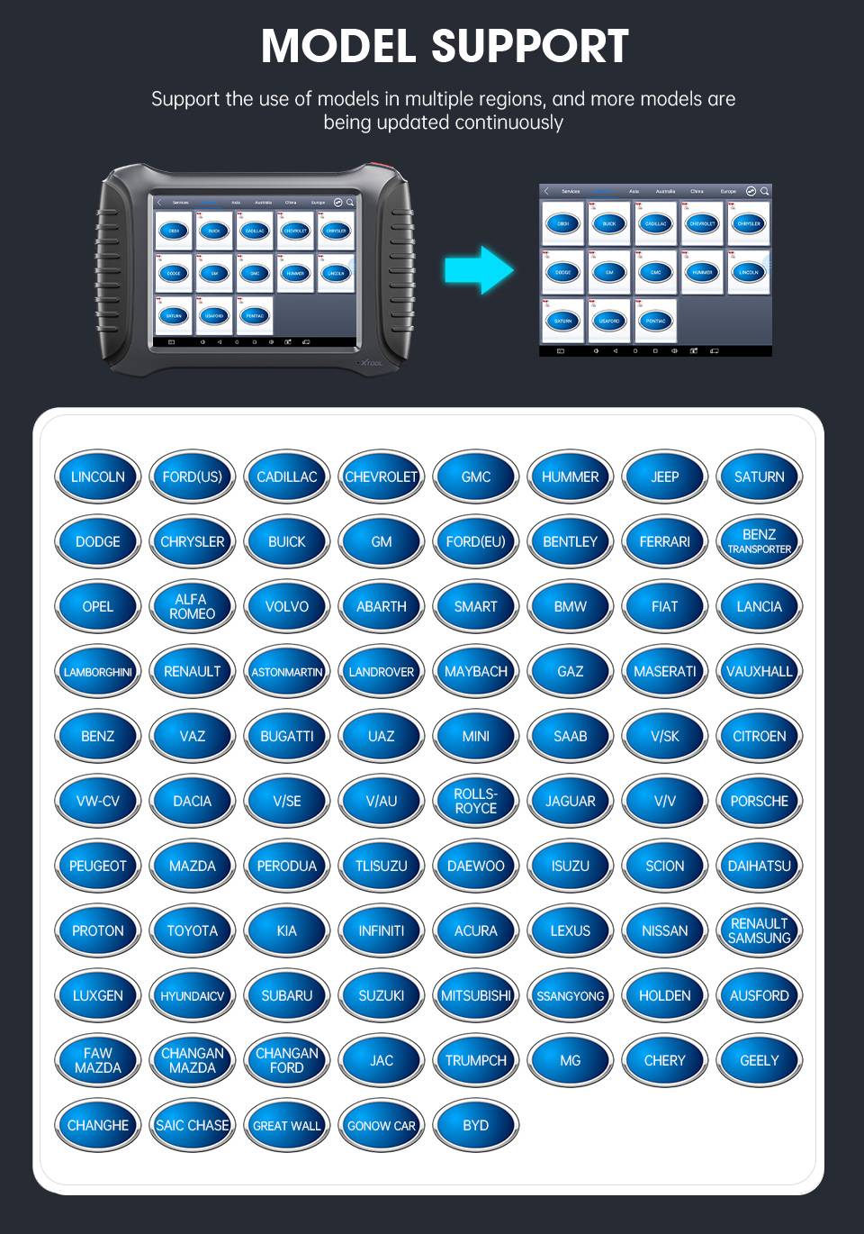A80 работает для большинства моделей автомобилей в мире и новейших моделей автомобилей с обновлением (сотни инженеров работают над обновлением программного обеспечения, a80 обновляет каждый 7-10 дней. Новейшие модели автомобилей будут работать с обновлением)