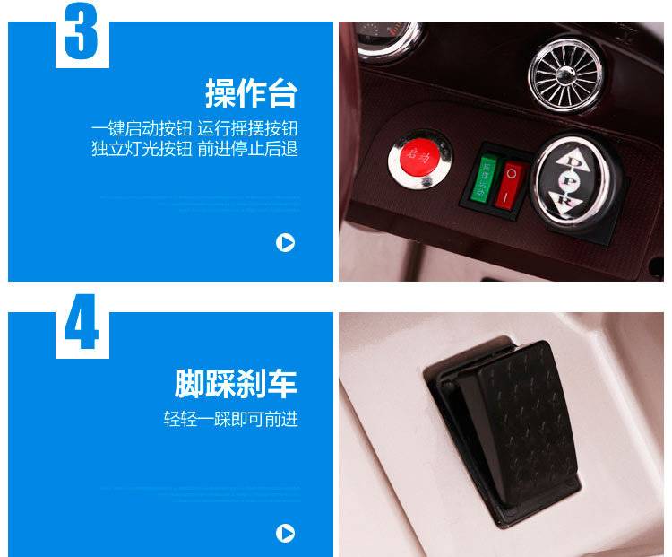 1. Просторный Двухместный2. Педаль акселератора предназначена для того, чтобы ребенок мог управлять автомобилем после запуска. Кроме того, он хорошо защищает ребенка.3. Большое Спортивное Рулевое колесо, спортивный дизайн, удобное сцепление, оснащено кнопкой рога и музыкальной кнопкой.4. Многофункциональный музыкальный плеер, с дисплеем питания, чтобы постоянно отслеживать оставшуюся мощность, с прослушиванием музыки и поддержкой внешнего подключения USB MP3 TF.5.-клавишный старт и три шестерни, один-клавишный старт, полный энергии, оснащен тремя шестернями для управления автомобилем вперед/назад и может переключаться на режим качания.