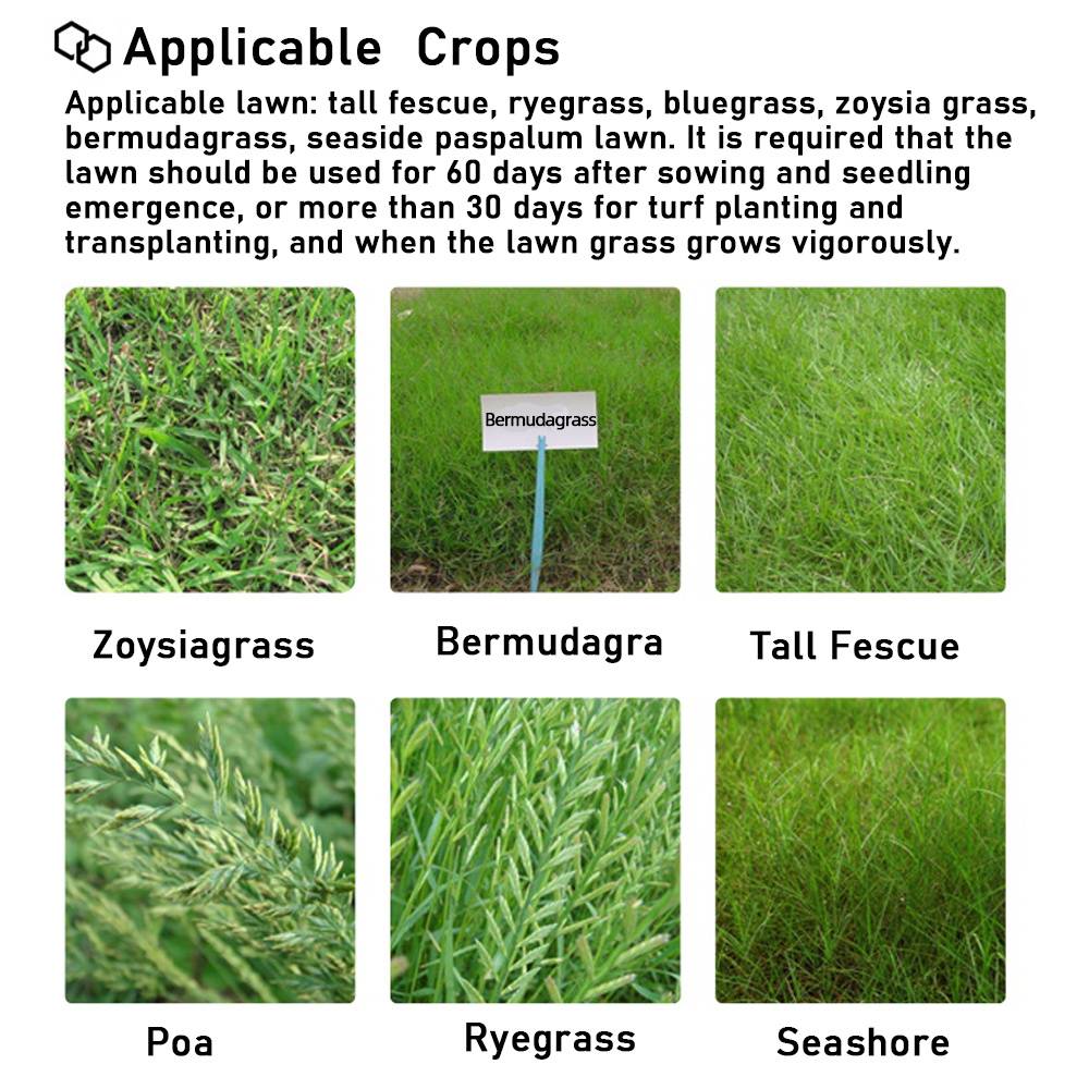 Применимый газон:Высокий феский, ryegrass, bluegrass, zoysia grass, бермудаграсс, Приморский пашпалумный газон, Poa, Crabgrass (Gramineae), cyperохране (cyperохране), кардамин (cyperохране), scabous (комбинированный).