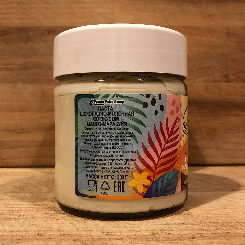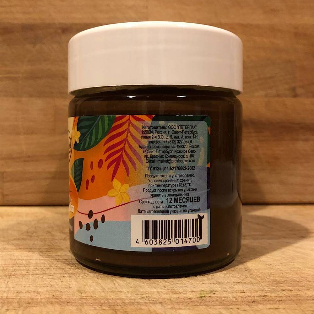 В составе сахар, растительные масла, паста ореховая из ядер фундука, какао-порошок, сухое обезжиренное молоко, сухая молочная сыворотка. Энергетическая ценность 570 ккал/100 г, белки 2.5 г/100 г, жиры 35 г/100 г, углеводы 60 г/100 г. Производитель ООО "ПЕТЕРПАК".