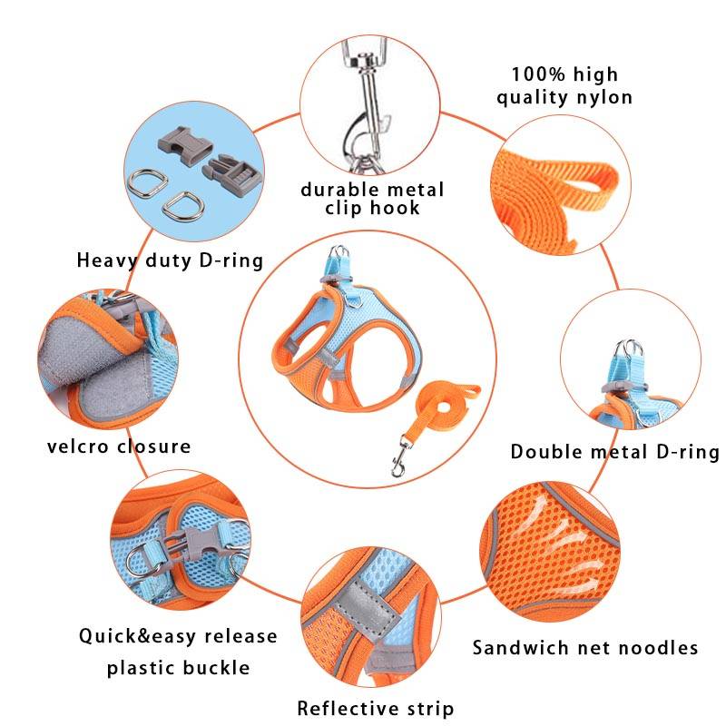 1. Мягкая и комфортная собачья шлейка с поводком-мягкая дышащая текстура без жестких краев или пряжек для раздражения кожи, уменьшения затягивания и натяжения на шею вашего питомца и комфортного отдыха вашего питомца.