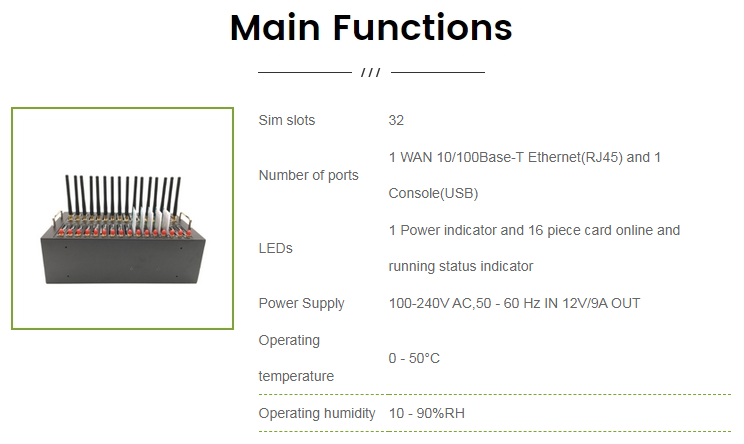 Четырехдиапазонный GSM модем: 4G (для использования по всему миру) Как и 32 одноканальных устройства, работающие одновременно Можно вставить 32 sim-карты (большие или маленькие) MTK GSM модем поддерживает изменение imei через команды AT Каждый порт отправляет около 3600 SMS в час Он может быть интегрирован с последовательным портом 32 через подключение кабеля передачи данных с компьютером Совместимая Операционная система: WIN7 / WIN8/WIN 10 и т. Д.Параметры продукта