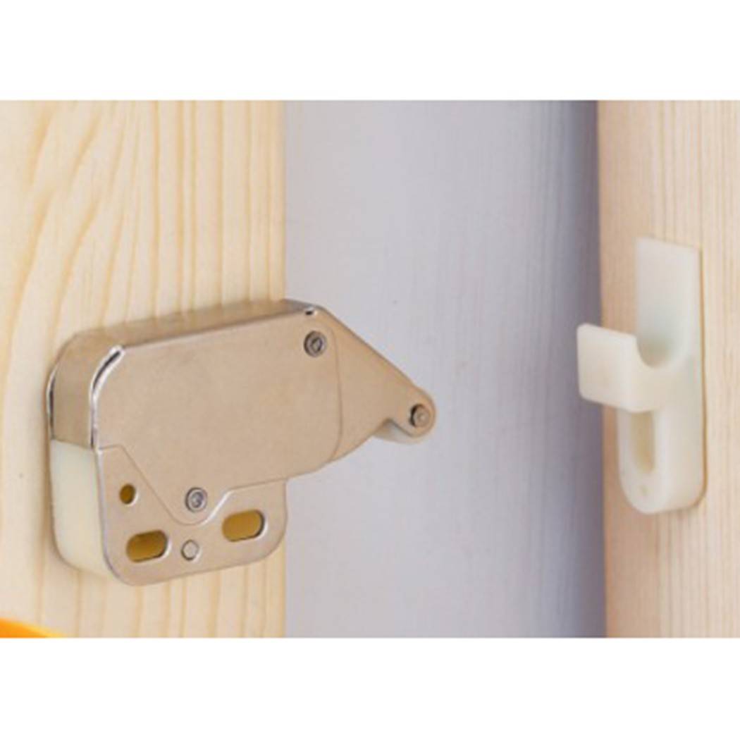 Дверь автоматически открывается, просто надавливая на саму дверь, тем самым активируя отпускную пружину в фитинге.