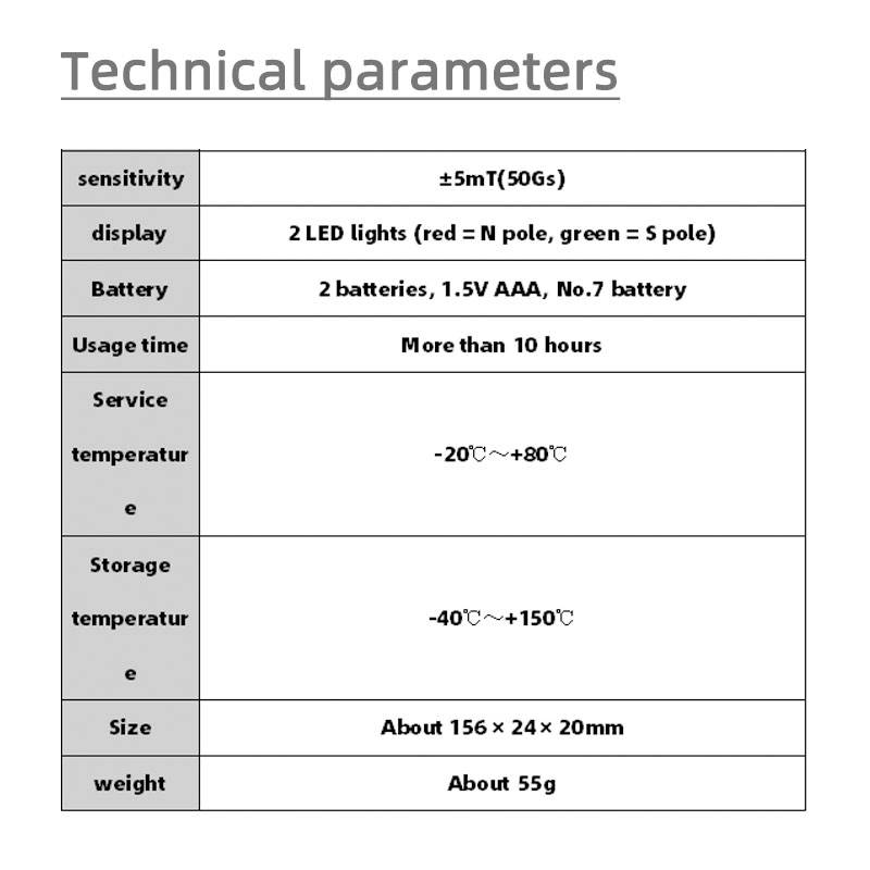 Ручка для идентификации магнитных полюсов-это быстрый, простой и безопасный инструмент, который используется для определения полярности магнитного поля. Полярность N / s может отличаться от контакта между зондом и предметом. Этот инструмент имеет характеристики высокой точности распознавания, маленький и светильник, простота в эксплуатации и тонкое мастерство.