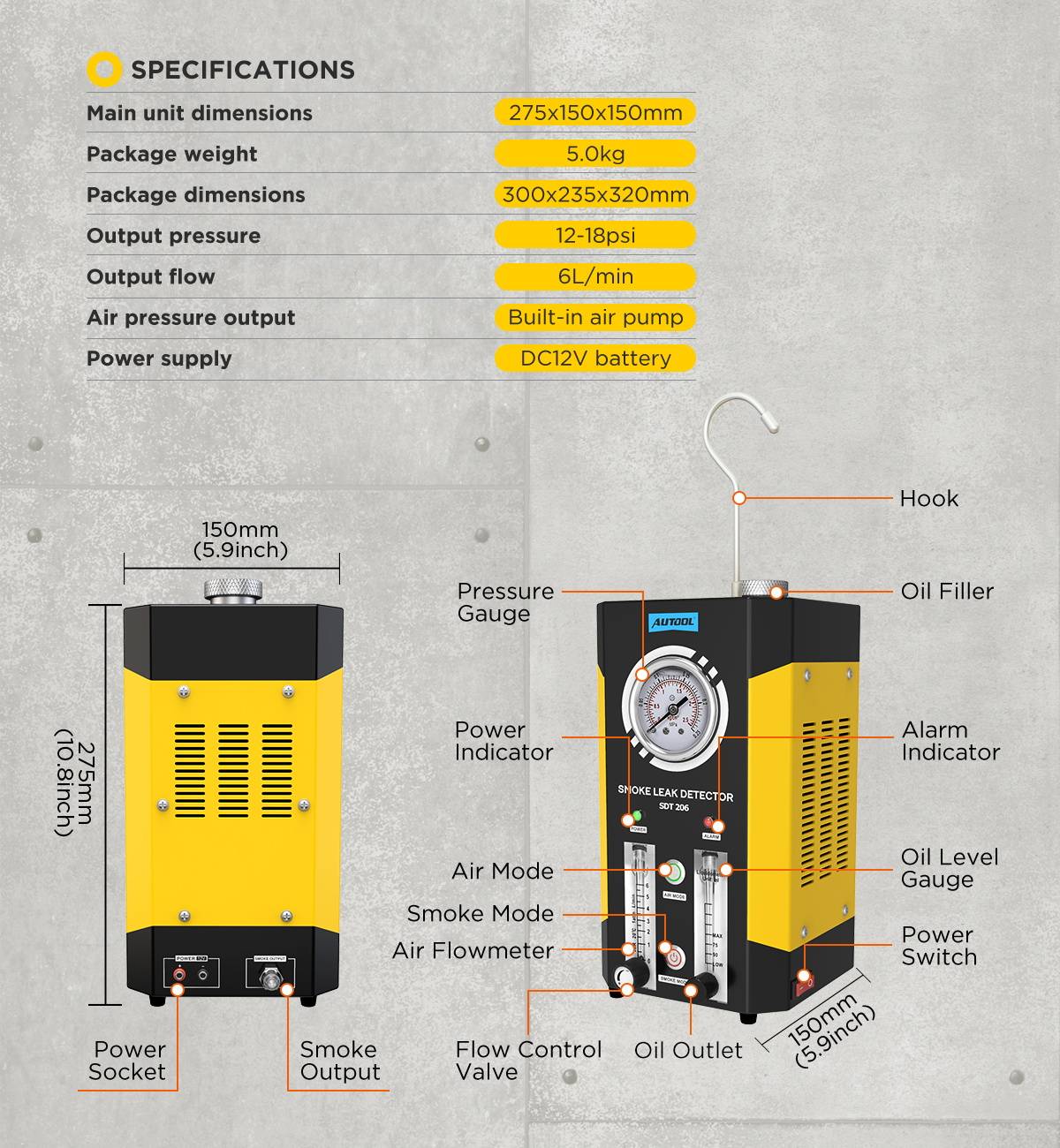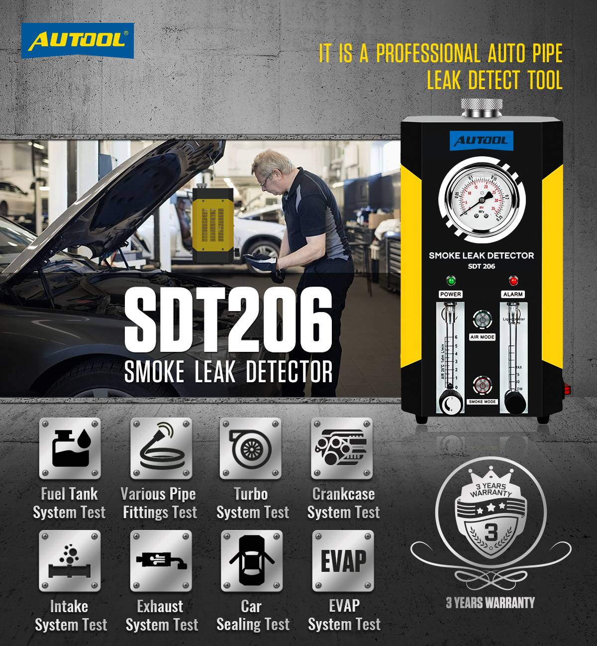 AUTOOL Модернизированный SDT 206 детектор утечки дыма для автомобиля-это профессиональный инструмент для обнаружения утечки автомобильных труб. Это поможет нам быстро и точно зафиксировать утечку автомобилей мотоциклов на трубной системе, например, тест на впускную систему, тест на выхлопную систему, тест на систему Картера, тест на герметизацию автомобиля, испытание системы топливного бака, испытание турбо-системы, испытание различных фитингов труб.