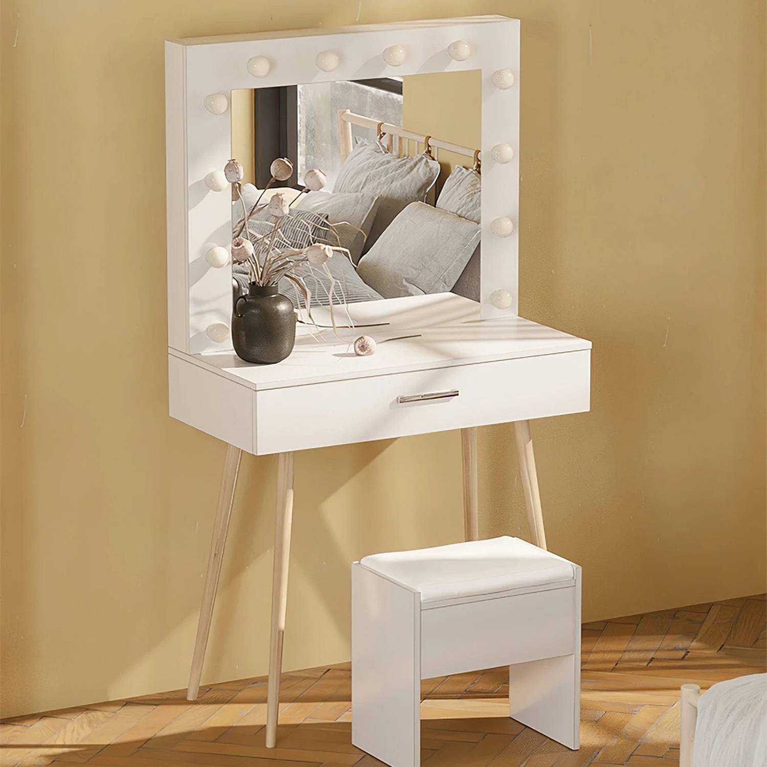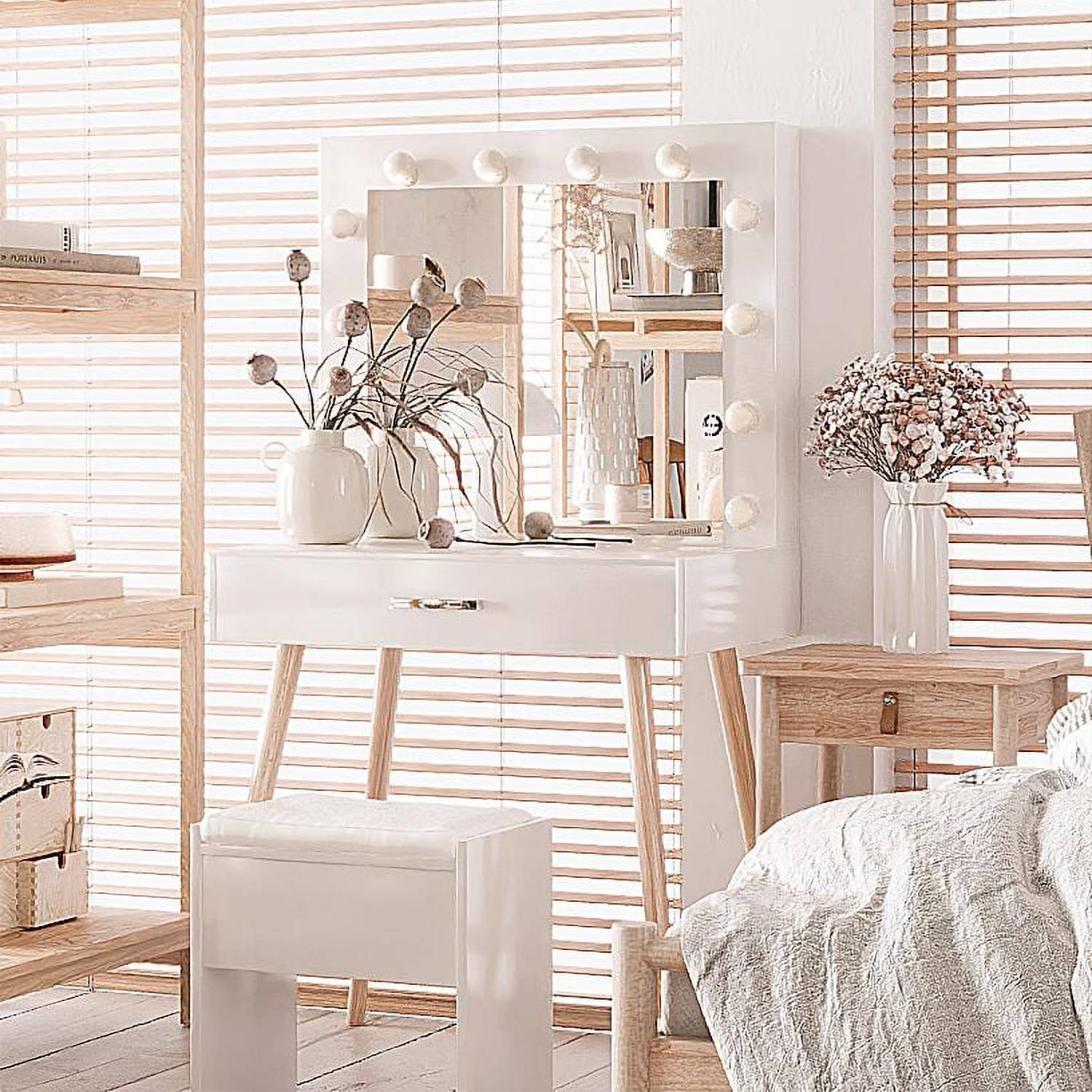 2. Высококачественный набор туалетных столиков: изготовлен из верхней MDF доски (стандарт E1), высококачественное мастерство делает поверхность туалетного столика гладкой и легкой в чистке. В комплект входит мягкий стул для макияжа. Модный и практичный, это первый выбор для мебели для спальни!