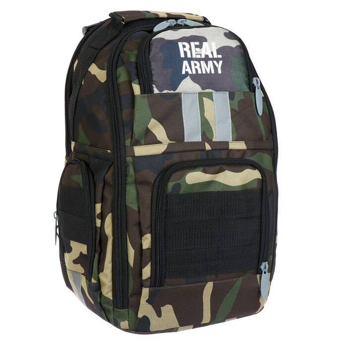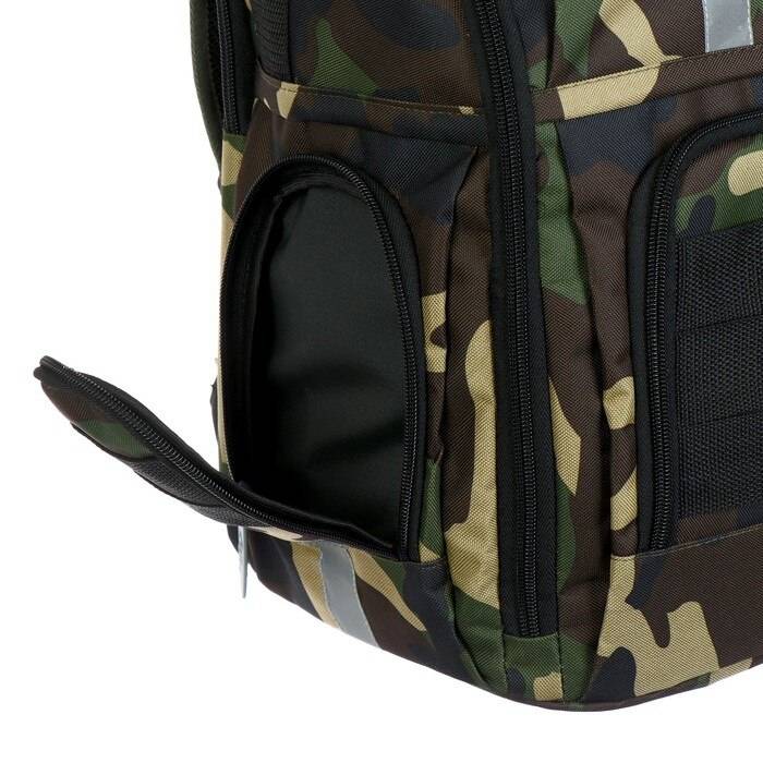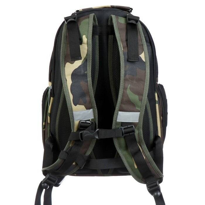 Имеется:вместительный основной отдел с внутренним карманом, малый узкий отдел, на передней стенке два объёмных кармана на молнии, два боковых кармана на молнии, жесткая спинка с мягкими вкладышами, образующими каналами для циркуляции воздуха, плотные заплечные S-образные лямки с нагрудной стяжкой, регулируются ремнями, фурнитура пластиковая, верхняя ручка оснащена текстильным подручником, дополнительные регуляторы высоты лямок и пояс и помогают добиться более комфортной посадки рюкзака на спине и правильного распределения нагрузки на позвоночник.