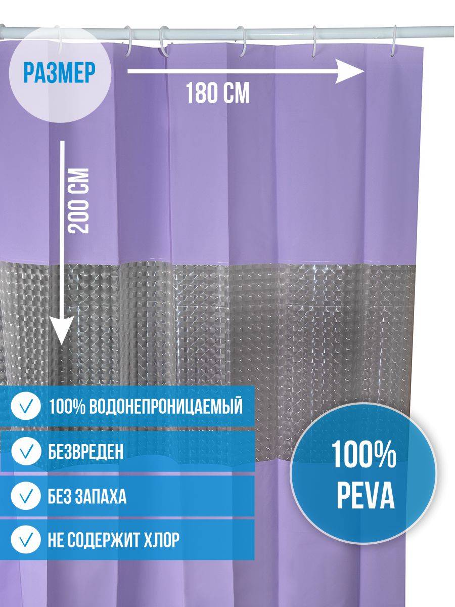 Занавеска для ванной из качественного пластика защитит вашу ванную комнату от брызг и влаги. Штора имеет современный дизайн и прекрасно смотрится в интерьере. Однотонное полотно дополняет оригинальная 3D-вставка, которая помимо декоративной функции имеет еще и способность пропускать свет, что очень удобно в помещениях с небольшим освещением. Материал штор - Пева, абсолютно водонепроницаем и не прилипает к телу. Для крепления на штангу шторка имеет 12 отверстий. Кольца для подвешивания в комплект не входят. Размер: 180 * 200 см.