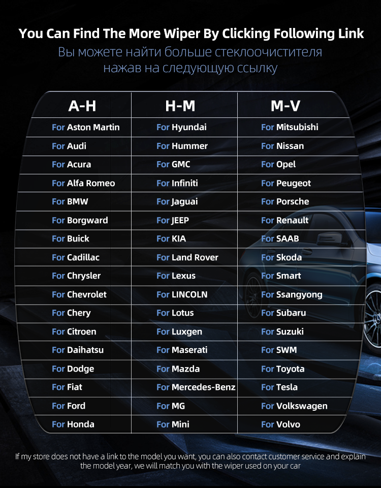 · Если вы не знаете, какие размеры у вас лопасти или какие виды приспособлений вам нужны, пожалуйста, обратитесь к нашему каталогу стеклоочистителей или отправьте нам сообщение, чтобы узнать, мы позаботимся о вас в течение 12 часов. И, конечно, мы не будем возвращать или заменять, если вы получите неправильные лезвия, не ссылаясь на наш каталог или не Запрашивая нас
