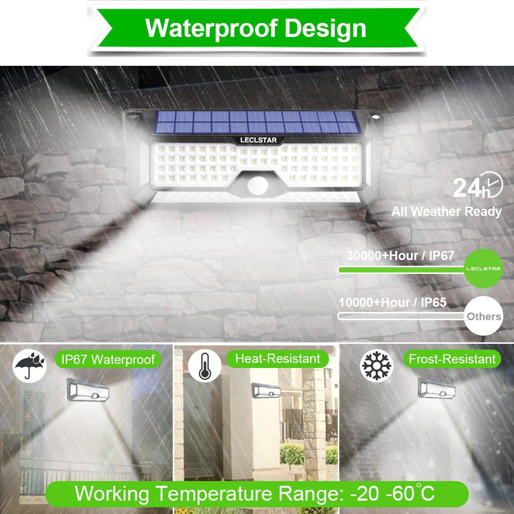 Солнечные огни на открытом воздухе изготовлены из прочного АБС-материала, вам не нужно беспокоиться об использовании в дождь. Датчик солнечного освещения может также выдерживать все виды тяжелых погодных условий, солнечные огни на открытом воздухе являются водонепроницаемыми, термостойкими и морозостойкими, они могут выдерживать дождь и другие экстремальные погодные условия