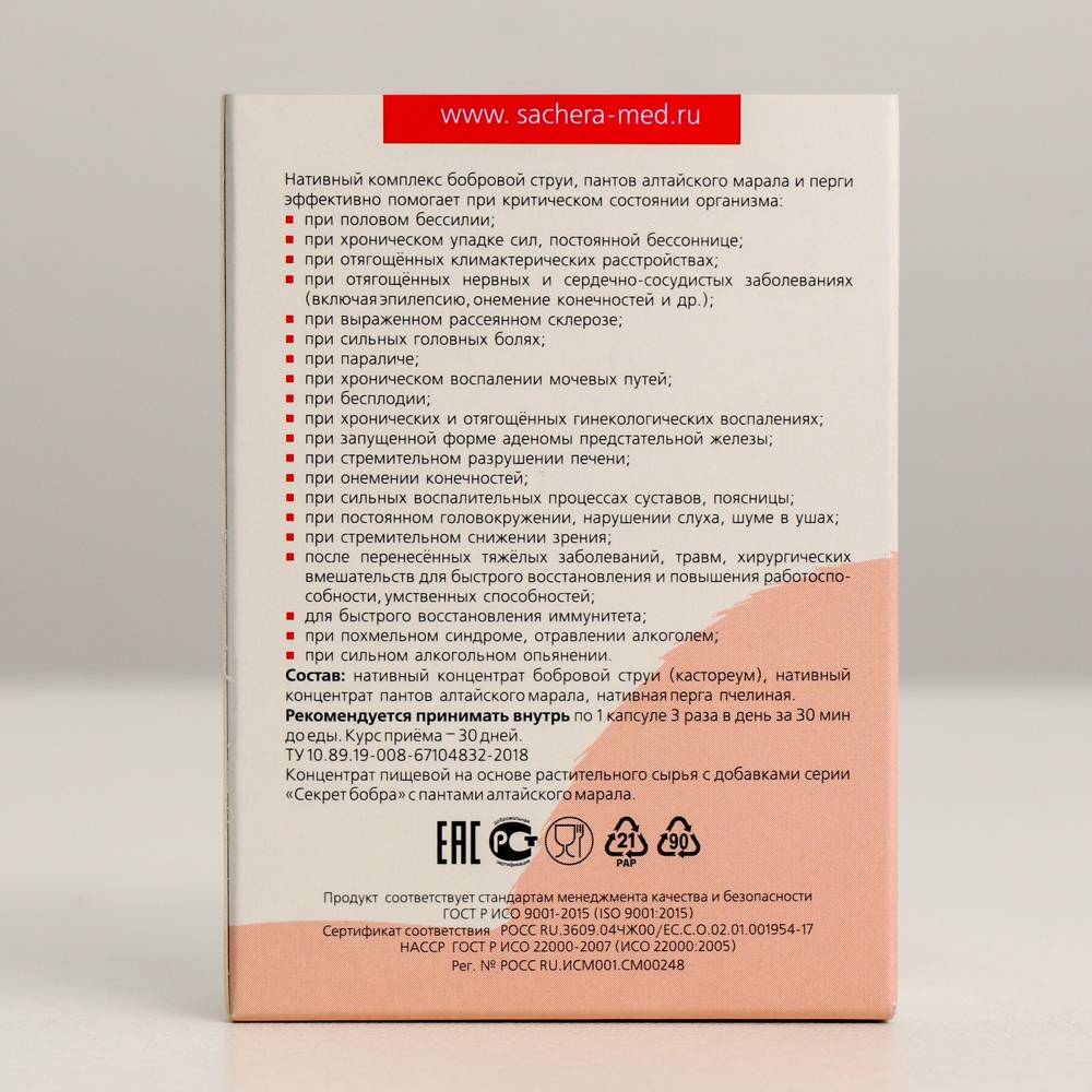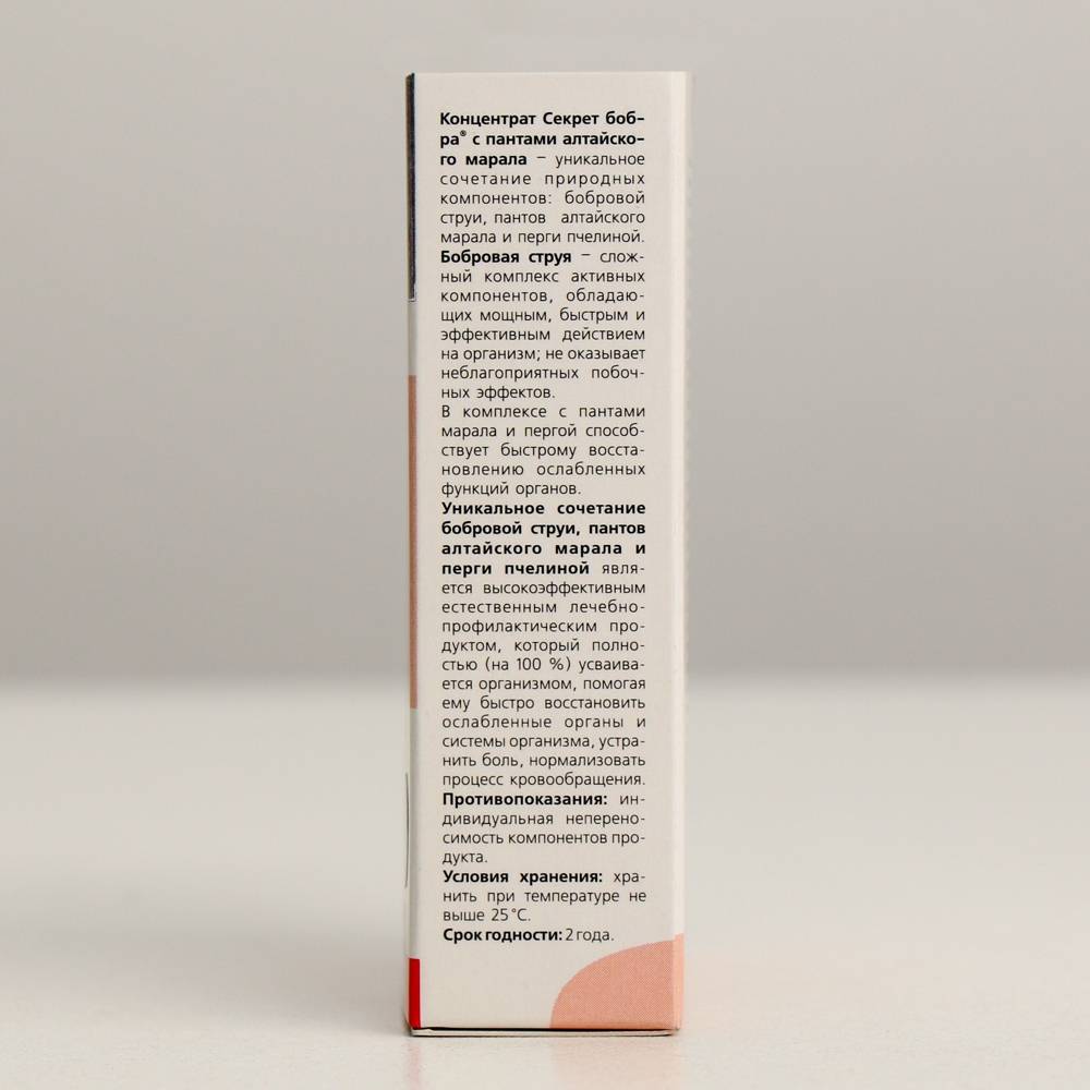 Состав: бобровая струя, медово-пантовая вытяжка, панты алтайского марала, перга пчелиная. Капсулы композиции «Секрет бобра»® отличаются усиленным воздействием, т.к. поступают в пищевод, где в течение 10 минут происходит растворение капсулы и высвобождение активных компонентов.
