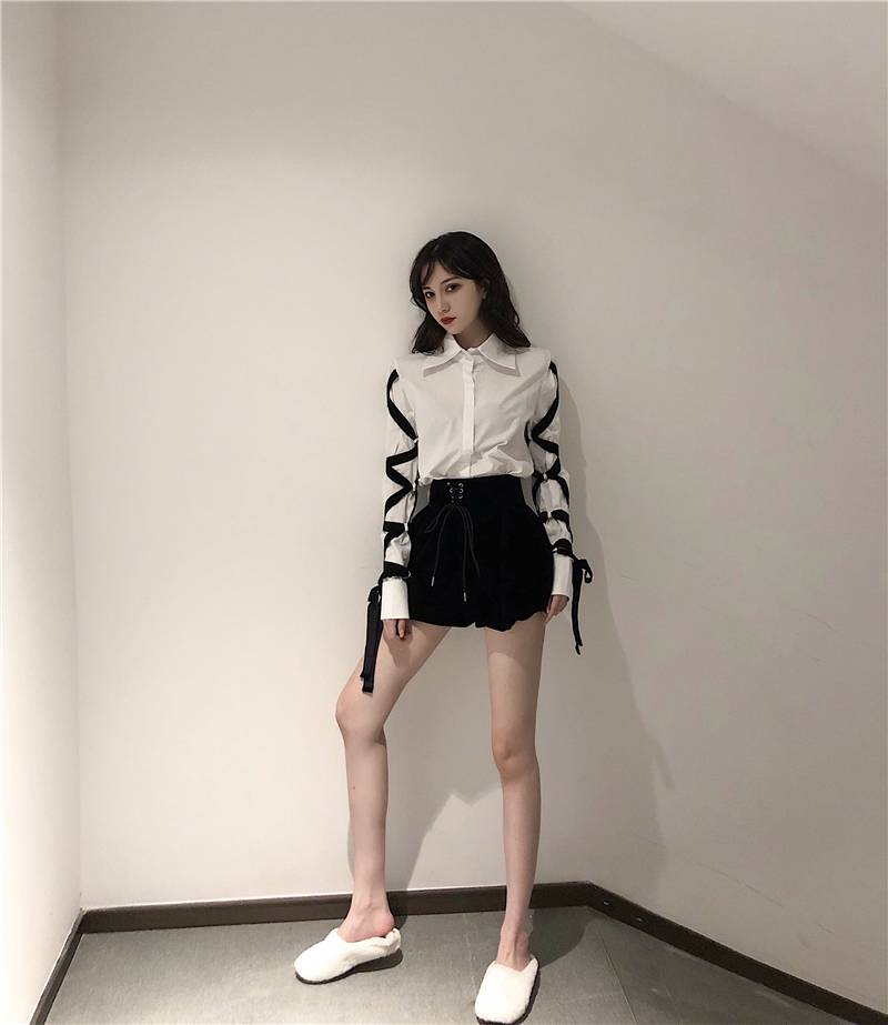 Весенняя белая блузка женские черные ленты бандажные однобортные рубашки топы винтажная Готическая уличная блузка хараджуку M035