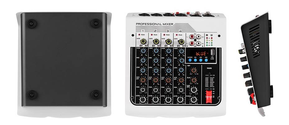 Миксер оснащен 4 разъемами MIC/LINE(RCA) mono и 2 стерео входными разъемами, эффектом реверберации и задержки, AUX и EFF для оптимальной регулировки уровня и входным интерфейсом USB MP3.