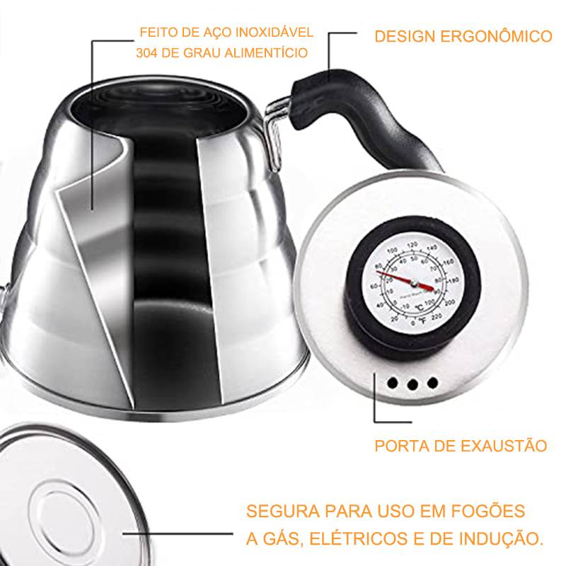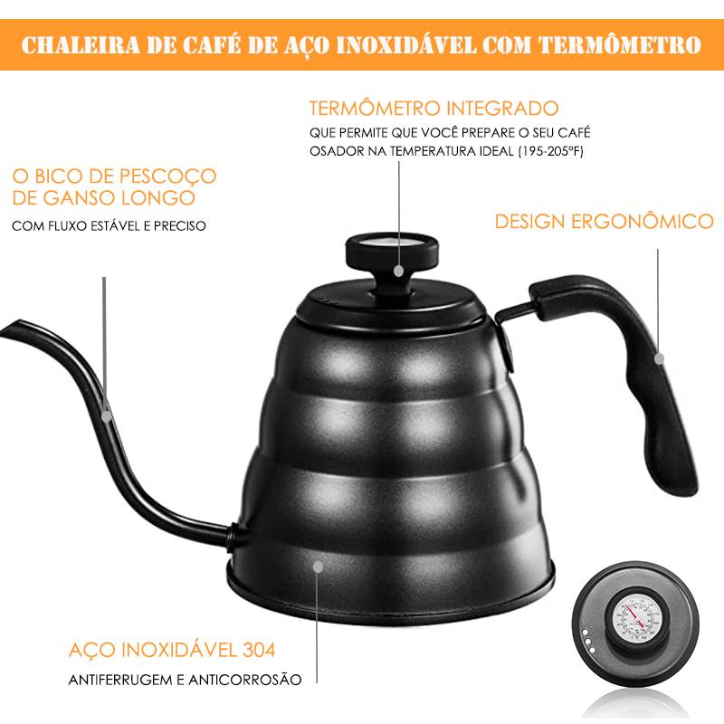 Termómetro integrado: Quer tomar uma boa xincara de café em casa ou no escritório? Além de um pacote precioso de grâos de café, você também precisa de um pote de café defecado. Оборудование seu barista interno com esta xincara de café. Используйте esta chaleira de pescoço de ganso para fazer um delicioso café em sua casa como um profissional. ● Соблюдайте que esta chaleira tem capacidade para 1,25 litros (40 oz), mas recomendamos ferver 1 litro de cada vez, ja que ferver a uma capacidade total corre o risco de transbordar.