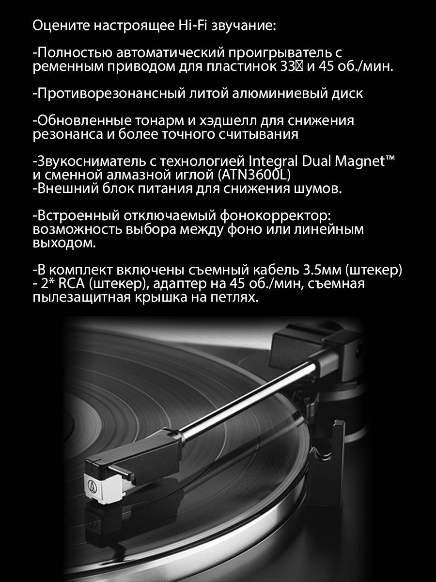 Начните свой путь в мир Hi-Fi звучания с нашим новым виниловым проигрывателем AT-LP60X-USB, оснащенным ременным приводом и полностью автоматическим управлением. Прогрыватель поддерживает воспроизведение на скорости 33 1/3 и 45 об./мин. Встроенный USB-разъем позволит вам подсоединить AT-LP60XUSB к компьютеру и сохранить фонотеку в цифровом виде. Просто установите на свой ПК или Mac необходимое ПО - и все готово к оцифровке ваших любимых записей. Помимо USB-разъема проигрыватель оснащен двумя разъемами RCA для проводного подключения (кабель в комплекте) и встроенным фонокорректором. Начните наслаждаться любимой музкой сразу после распаковки!