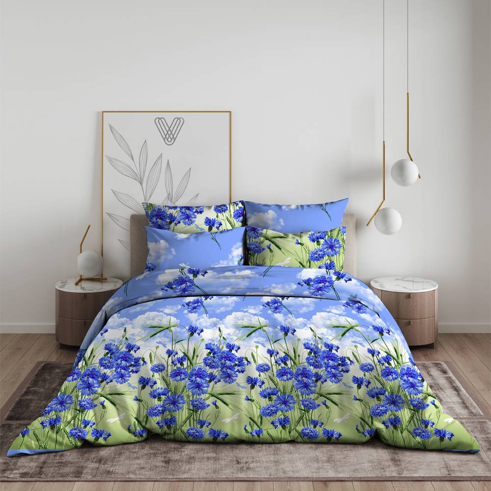 Постельное белье «Василиса»-свежесть русского поля, цветение василька, Нежные оттенки неба и лета, которые не заканчиваются. Постельное белье изготовлено из 100%-хлопковой ткани бязь средней плотности 120 гр. Натуральный хлопок является абсолютно экологически чистым, не вызывает аллергии, хорошо пропускает воздух, позволяя телу дышать. Соблюдая рекомендации по уходу, ткань легко стирается, не садится и практически не мнется, позволяя гладить белье без парения. В то же время ткань остается мягкой и нежной благодаря инновационной системе мягкой ткани, в которой изделие придает гладкую матовую поверхность и улучшает тактильные ощущения. Способ крепления наволочки-клапан шириной 25 см, что очень удобно, при использовании наволочки не открывается, пододеяльник-это отверстие без застежки по краю и красивая современная упаковка в качестве неотъемлемой части подарка для вас и ваших близких, Приносит радость и чувство ожидания.