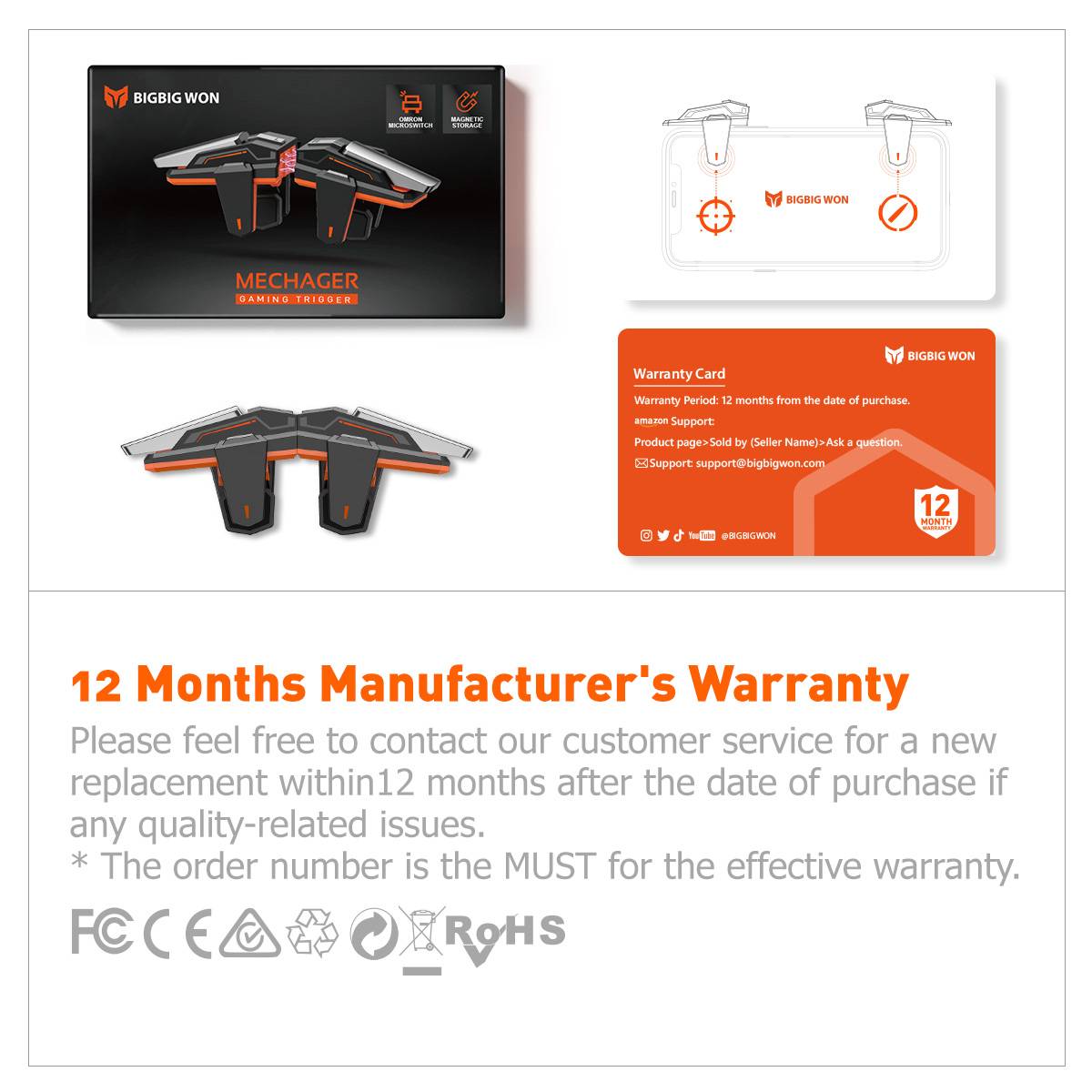 5.【 100% Удовлетворенность 】включает 2 * триггера для мобильных игр, 1 * Руководство по эксплуатации. BIGBIG WON стремится обеспечить лучший мобильный контроллер запуска нашего клиента. 30 дней бесплатной замены или полного возврата и 12 месяцев гарантии. Срок службы до продажи и послепродажное обслуживание, пожалуйста, не стесняйтесь связаться с нами, детализируя ваш номер заказа и проблему, с которой вы столкнулись. Мы ответим вам в течение 24 часов.