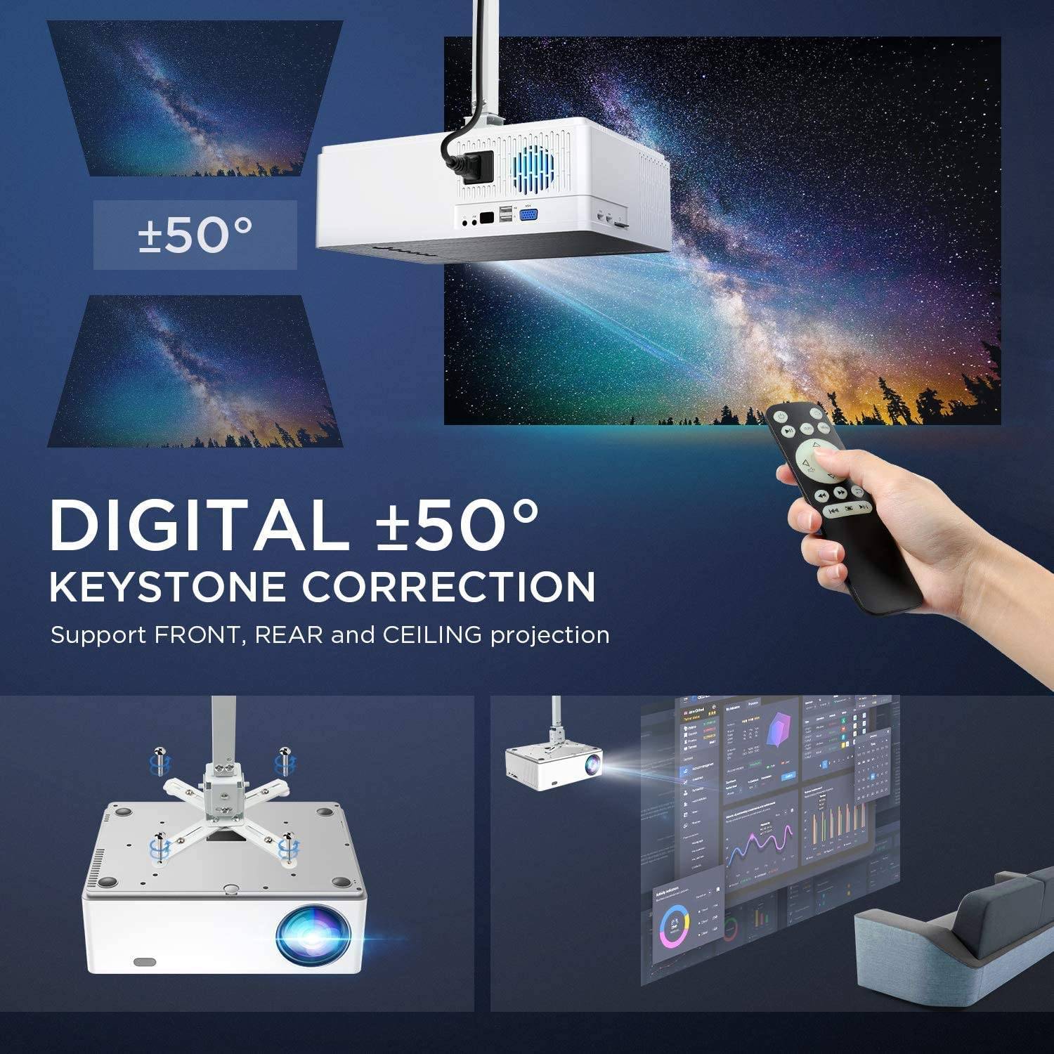 Оснащен3D + 6D многомодовая коррекция keystone, Прикроватные столы, диваны, журнальные столы, потолки и квадратные экраны могут быть спроектированы независимо от того, где они находятся. Даже если вы поместите его под углом, вы всегда можете сделать экран квадратным.Уменьшает хлопот, позволяет легко настроить, получить лучший опыт просмотра.